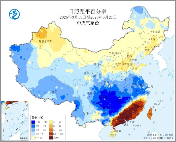 本周(2026年3月15日-2026年3月21日),全国大部农区平均气温接近常年同期或偏低1~2℃,仅浙江大部、江西南部、福建、广东、广西中部和南部、四川西北部等地偏高1~4℃(图1)。黄淮南部、江淮、江汉、江南、西南地区东部和西南部、华南北部等地降水量有10~50毫米,其中湖北南部、湖南北部、江西西北部、安徽南部和云南西北部等地部分地区达50~100毫米(图2),上述大部地区降水较常年偏多3成至4倍,云南西南部偏多4倍以上,全国其余大部地区降水量不足10毫米或无降水。本周,全国大部农区日照时数接近常年同期或偏少(图3),其中新疆南疆西部、黄淮东南部、江淮、江汉大部、江南西部和北部、西南地区东部、华南西北部等地偏少5~9成,仅新疆西北部、江西南部、福建、广东和广西东部等地偏多5成至2倍。