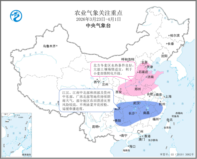 建议:北方冬麦区密切关注冬小麦苗情和墒情变化,做好水肥调配和春季田间管理。江汉、江南、西南地区东部等降水偏多地区及时疏通沟渠,确保田间排水通畅,降低土壤湿度,防范渍害发生;同时加强油菜菌核病、小麦条锈病等病虫害的监测和防控。未播种地区抓住无雨时段适时播种,早稻已播地区做好秧棚保温和秧田排水,防止烂种烂秧。春茶采摘区抓住雨停间隙进行抢摘,减少损失。此外,各地可抓住降水有利时机,做好库塘蓄水,保障后期农业生产用水需求。
