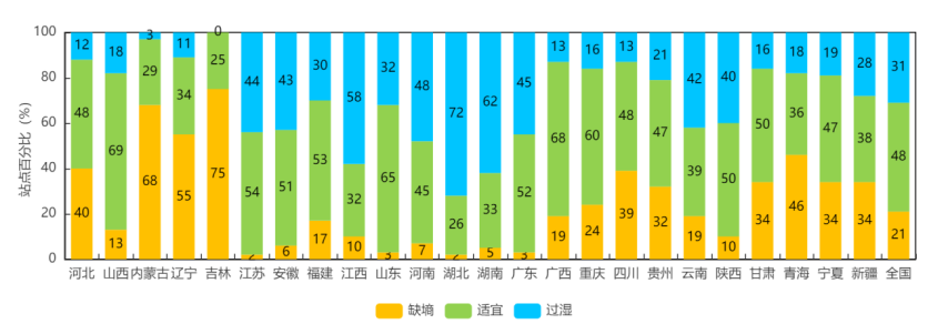 附图2 3月22日分省20厘米土壤墒情统计(站点百分比)