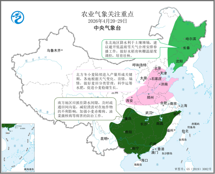 建议:北方冬小麦陆续进入产量形成关键期,各地根据天气变化、苗情、墒情,做好麦田分类管理、科学运筹水肥,促进小麦稳健生长。北方春播区加快春耕整地备播工作;已播棉花、春小麦、玉米等做好田间管理,查苗补种。东北土壤偏湿地块适时排涝散墒,雨后及时中耕松土,避开雨雪天气趁墒播种;水稻产区做好育秧棚防风保暖和温湿度调控工作,培育壮秧。南方地区应抓住降水间隙,及时疏通田间沟渠,减轻渍涝对在地作物的不利影响,加强小麦赤霉病、油菜菌核病等病害的防治工作。江南早稻产区避开强降水时段完成水稻移栽工作,及时查苗并采取补种措施。此外,各地应做好设施农业检修加固,及时修补更换破损覆盖材料,防范大风降温以及强对流天气的不利影响。