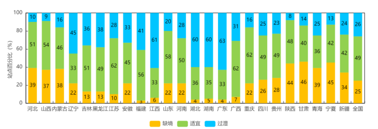 附图2 4月18日分省20厘米土壤墒情统计(站点百分比)