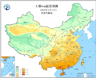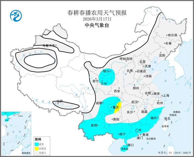 预计17日重庆东部有小雨,春耕春播气象条件等级为次适宜;其余春播区以晴到多云天气为主,春耕春播气象条件等级为适宜(图5)。