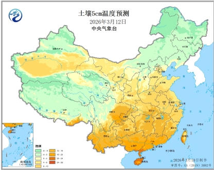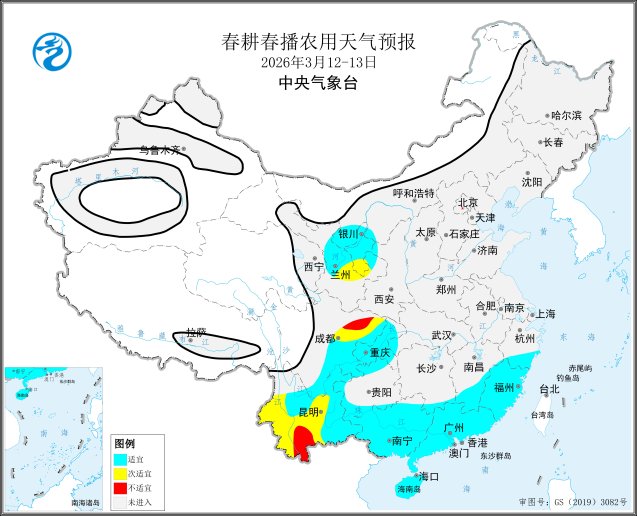 预计12-13日,宁夏南部、甘肃陇中、四川北部、云南中西部等地部分地区有小雨,春耕春播气象条件等级为次适宜;四川盆地西北部、云南南部部分地区有中雨,春耕春播气象条件等级为不适宜;其余春播区以晴到多云天气为主,春耕春播气象条件等级为适宜(图2)。