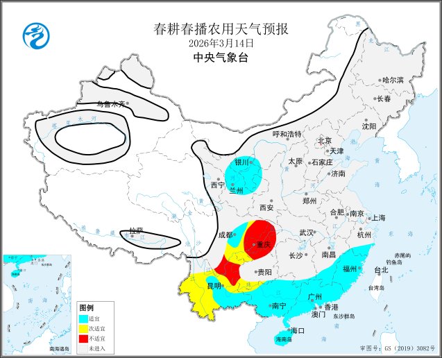 预计14日,云南大部、四川东部等地有小雨,春耕春播气象条件等级为次适宜;四川东北部、重庆大部、云南东北部等地有中到大雨,春耕春播气象条件等级为不适宜;其余春播区以晴到多云天气为主,春耕春播气象条件等级为适宜(图3)。