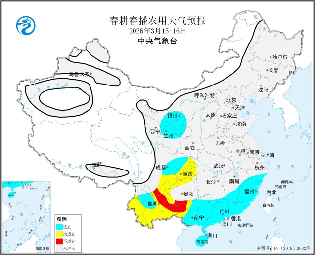 预计15-16日,四川东南部、重庆大部、云南中南部和东北部、广西西部等地有小雨,春耕春播气象条件等级为次适宜;云南滇中北部、广西西北部等地有中到大雨,春耕春播气象条件等级为不适宜;其余春播区以晴到多云天气为主,春耕春播气象条件等级为适宜(图4)。
