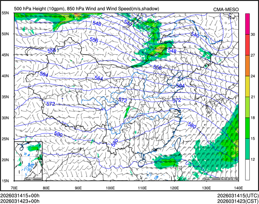 500hPa高度+850风场+850大风速(大于等于12)