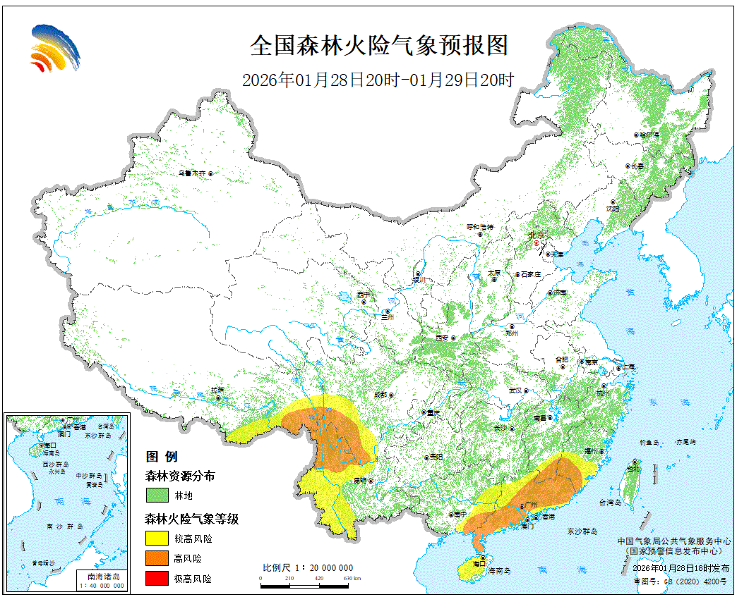 预计,2026年1月28日20时至1月29日20时,福建南部、江西南部、广东大部、广西东部、海南大部、四川西南部、云南北部和西部、西藏东南部等地的部分地区森林火险气象等级较高,其中,福建南部、江西东南部、广东东部和南部、广西东南部、四川西南部、云南西北部、西藏东南部的局部地区森林火险气象等级高。请各有关单位严加防范,加强火源管理,确保林区安全。