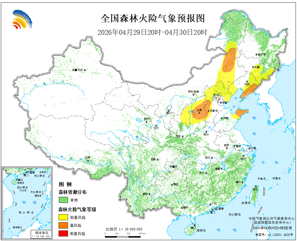 预计,2026年4月29日20时至4月30日20时,北京北部、河北西部和北部、山西中部和北部、内蒙古东部、辽宁东部和西南部、吉林中部和东部、山东东部、陕西北部等地的部分地区森林火险气象等级较高,其中,河北西部、山西中部、内蒙古东部、辽宁东部、山东东部的局部地区森林火险气象等级高。请各有关单位严加防范,加强火源管理,确保林区安全。