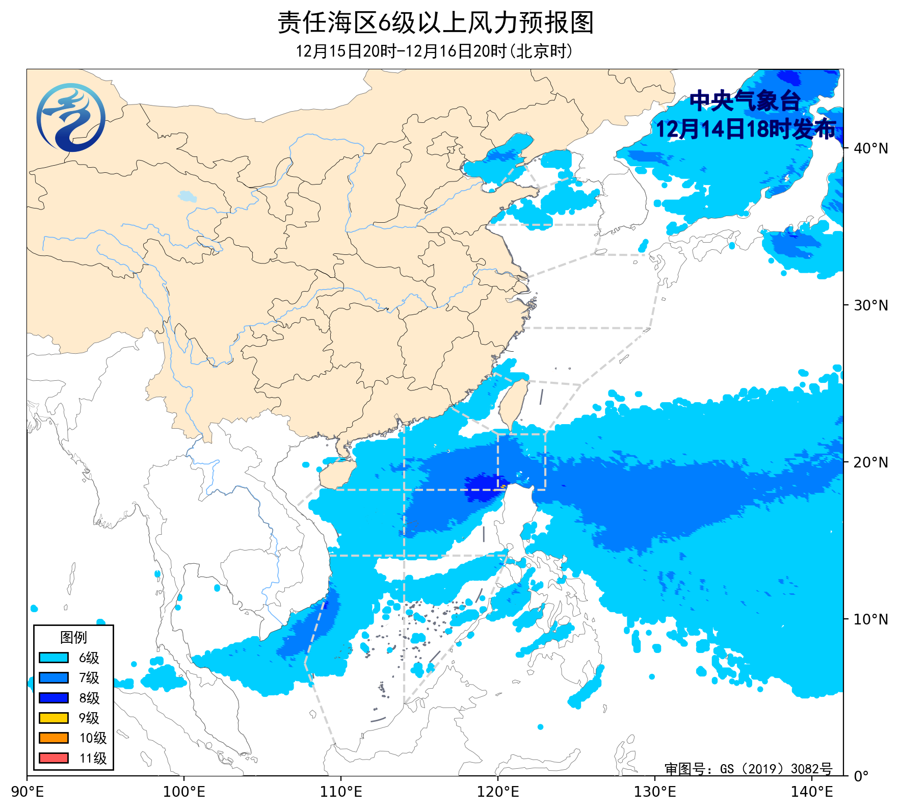 预计,17日夜间至19日夜间,渤海、渤海海峡、黄海大部海域、东海南部海域、台湾海峡、巴士海峡、北部湾、南海北部和中部海域将有6~7级、阵风8级的大风,其中南海东北部的部分海域风力可达8级、阵风9级。20日白天至21日白天,渤海、渤海海峡、黄海大部海域、东海大部海域、台湾海峡、巴士海峡、台湾以东洋面、南海大部海域将有6~7级、阵风8级的大风,其中黄海南部海域、东海北部海域的部分海域风力可达8级、阵风9级,台湾海峡、巴士海峡、南海东北部的部分海域风力可达8~9级、阵风10级。