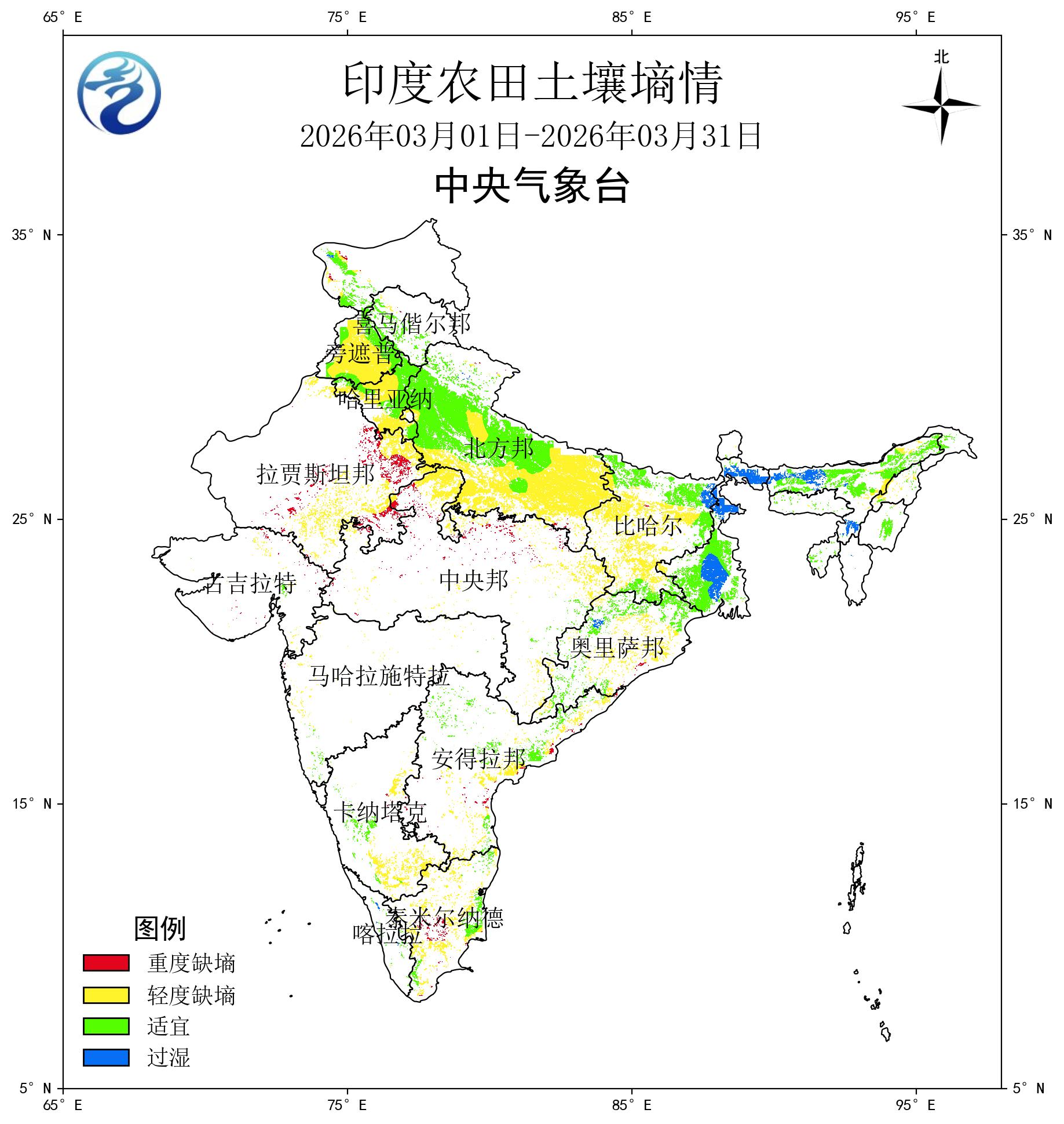 3月,印度北部冬小麦主产区平均气温为24~28℃,较常年同期偏高1~4℃(图10),热量条件利于冬小麦生长发育和产量形成。月内,主产省北方邦中西北部、比哈尔邦、哈里亚纳、旁遮普邦等地麦区出现明显降水,降水量有10~100毫米(图11),利于麦田增墒和冬小麦抽穗灌浆,前期部分地区农田缺墒状况得到改善;北方邦东部、中央邦中西部、拉贾斯坦邦南部等地降水偏少,部分农田缺墒(图12),对冬小麦孕穗抽穗和灌浆不利。
