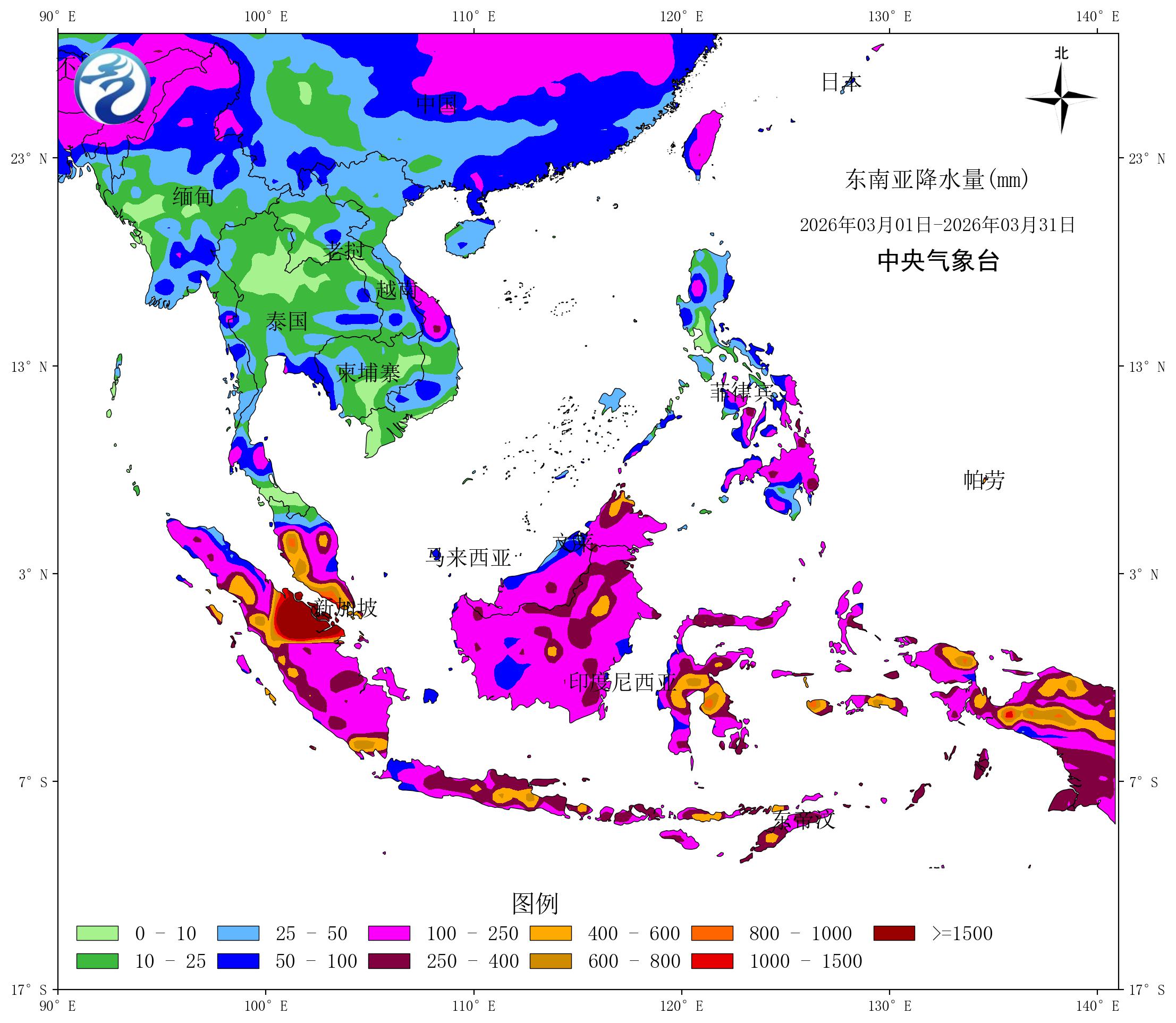 3月,印度尼西亚、马来西亚和菲律宾南部大部降水量有100~250毫米(图13),不利于头季水稻成熟收获;但充足降水利于春季已播种和夏季将要播种的水稻生产用水及农业蓄水。月内,泰国、越南、老挝等地处于旱季,虽大部降水偏少,但得益于前期蓄水充足,二季水稻和玉米的生长发育未受明显影响。