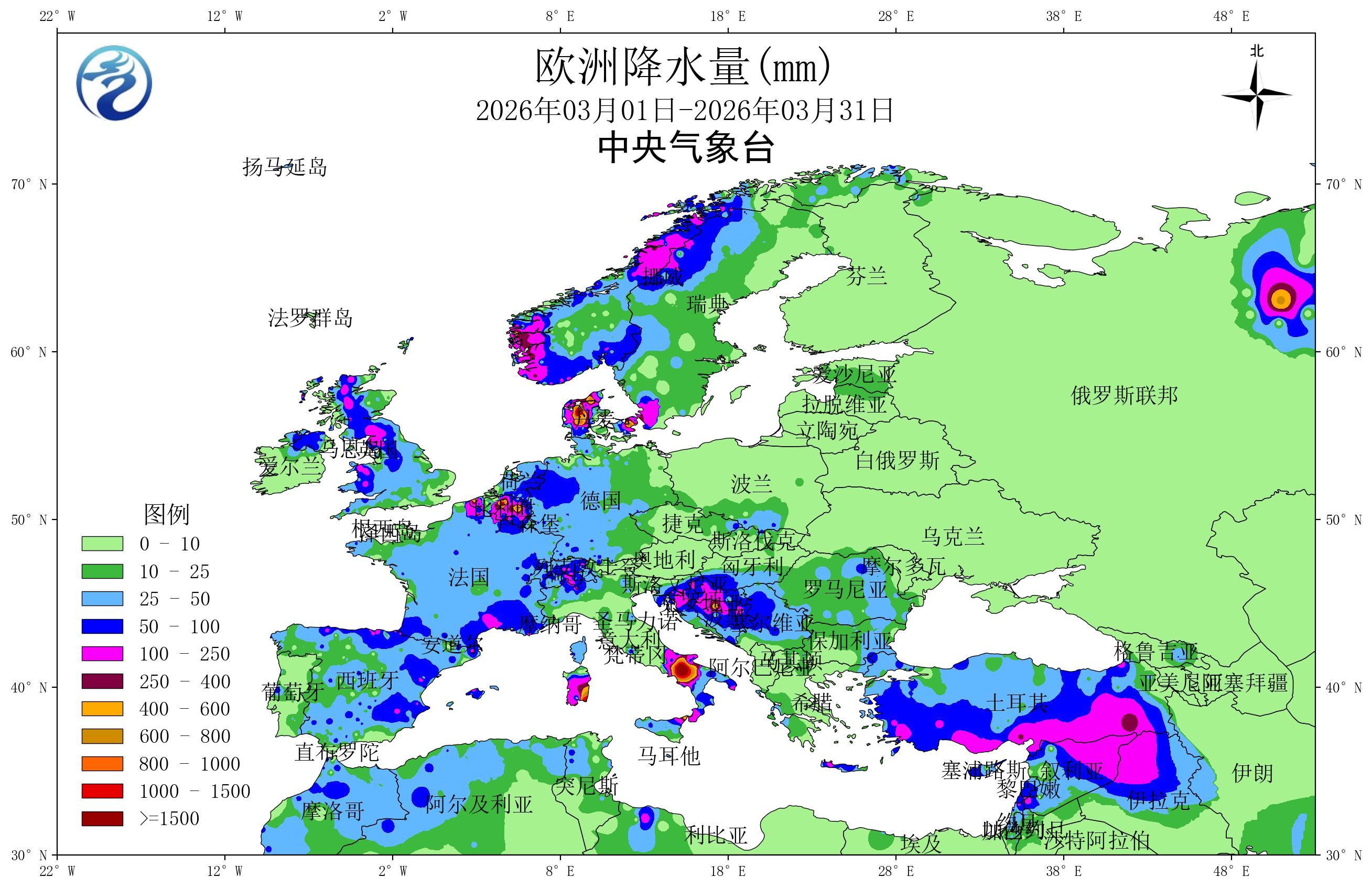 3月,欧洲西部大部地区上中旬气温较常年同期偏高,其中冬小麦主产区法国和德国气温偏高1~4℃(图14),并出现25~100毫米降水(图15),大部农田墒情适宜,水热条件利于冬小麦萌动和返青生长,发育期较常年提前约2周;下旬受冷空气影响,气温偏低1~3℃,降温延缓了前期小麦快速发育态势,因低温持续时间有限,麦区无明显冻害发生。月内,葡萄牙和西班牙大部降水量为25~100毫米,土壤墒情适宜,利于冬小麦拔节生长;意大利出现10~250毫米降水,前期部分农田旱象缓解。