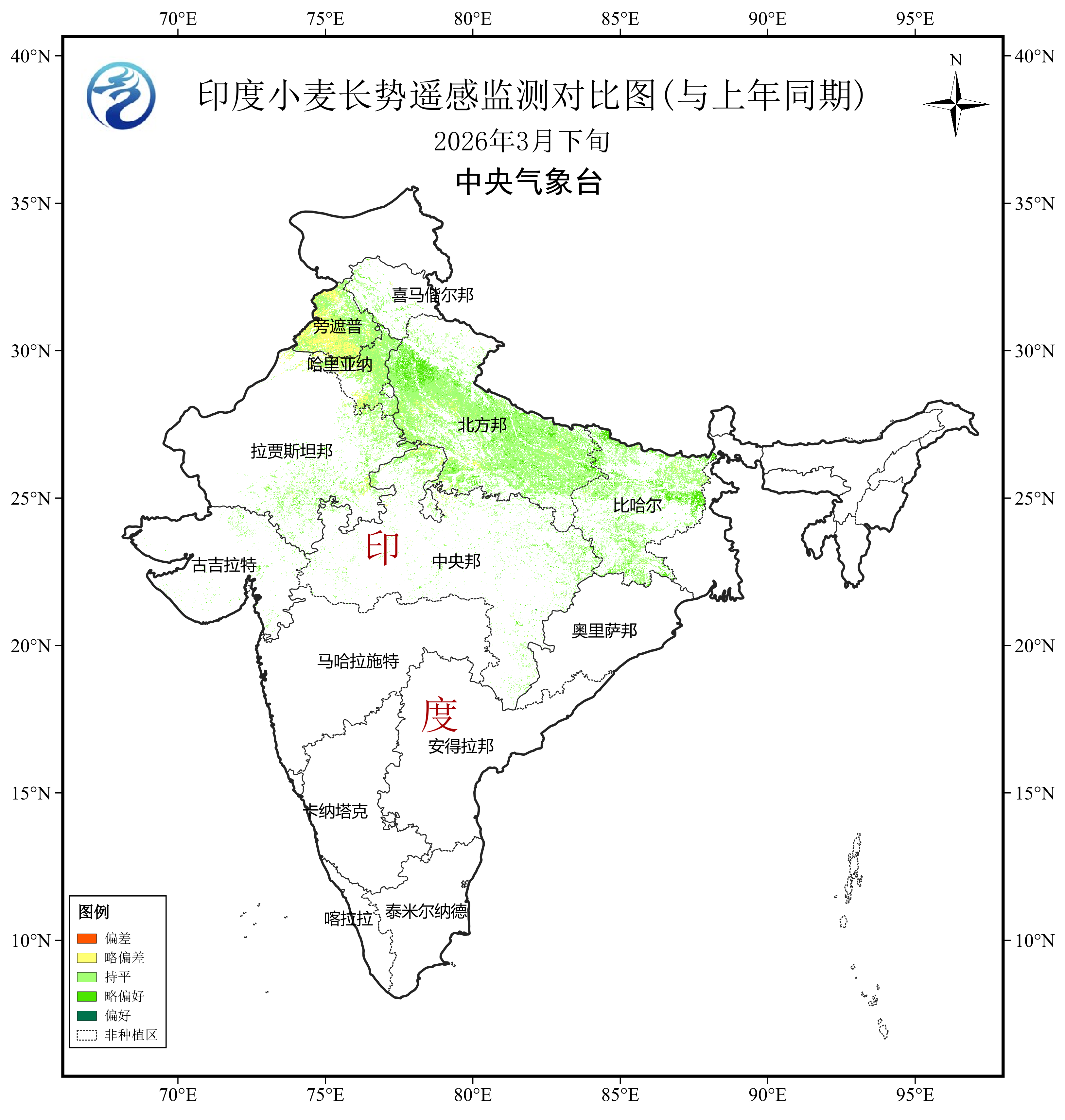 3月下旬卫星遥感监测结果显示,印度小麦长势与上年同期相比,持平比例为79%,偏好比例为10%,偏差比例为11%,小麦整体长势与上年同期持平(图20)。