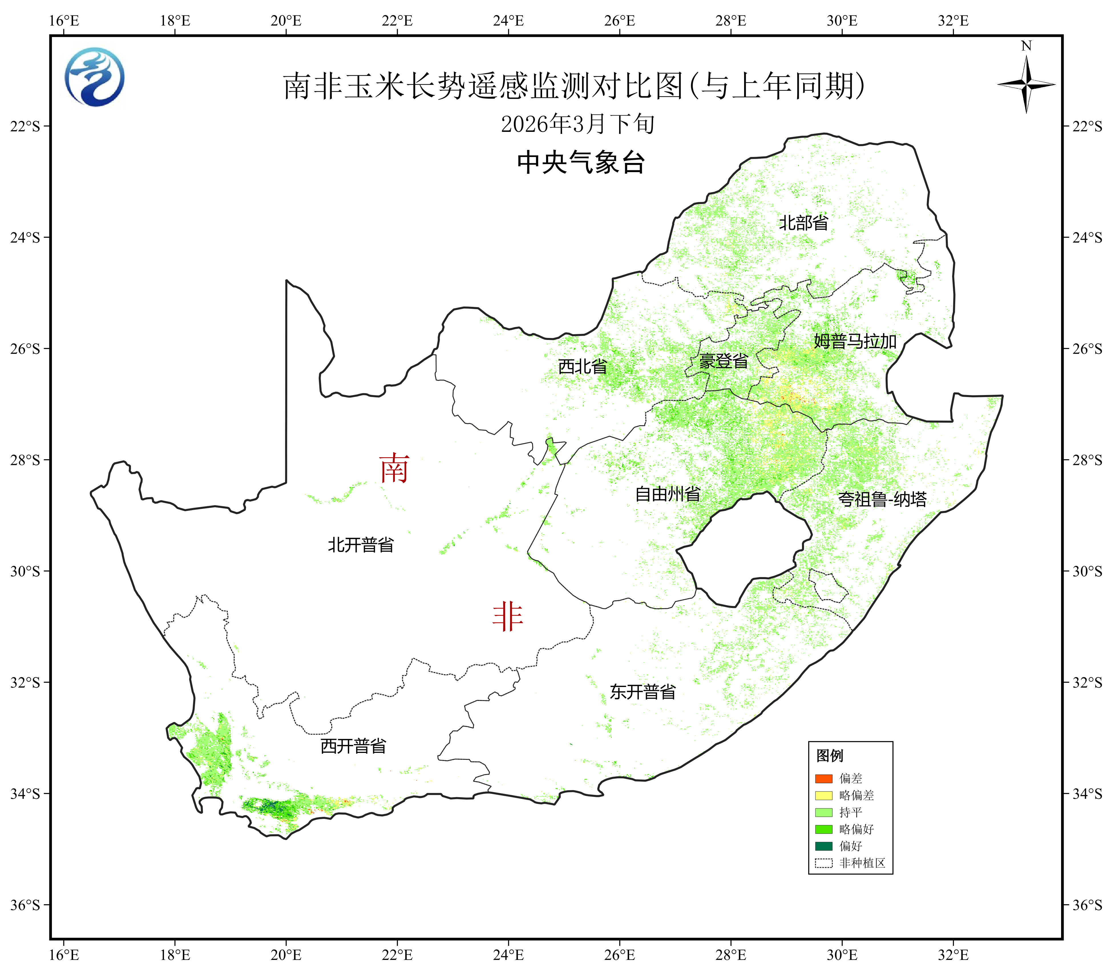 3月卫星遥感监测结果显示,与上年同期相比,南非玉米长势持平比例为81%,偏好比例为9.5%,偏差比例为9.5%,玉米整体长势与上年同期持平略偏好(图21)。