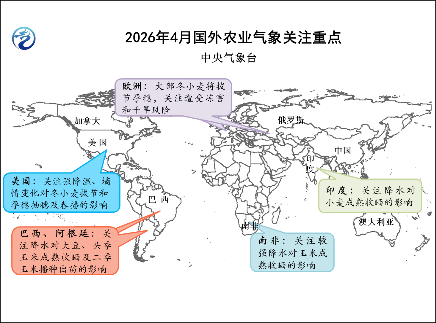 4月重点关注降水对印度冬小麦、南美大豆和玉米等作物成熟收晒的影响;关注强降温过程、降水及墒情变化对美国和欧洲冬小麦返青拔节、孕穗抽穗的影响;此外,美国、欧洲各地春播将陆续展开,需关注降水和墒情变化及气温起伏对春播的影响。