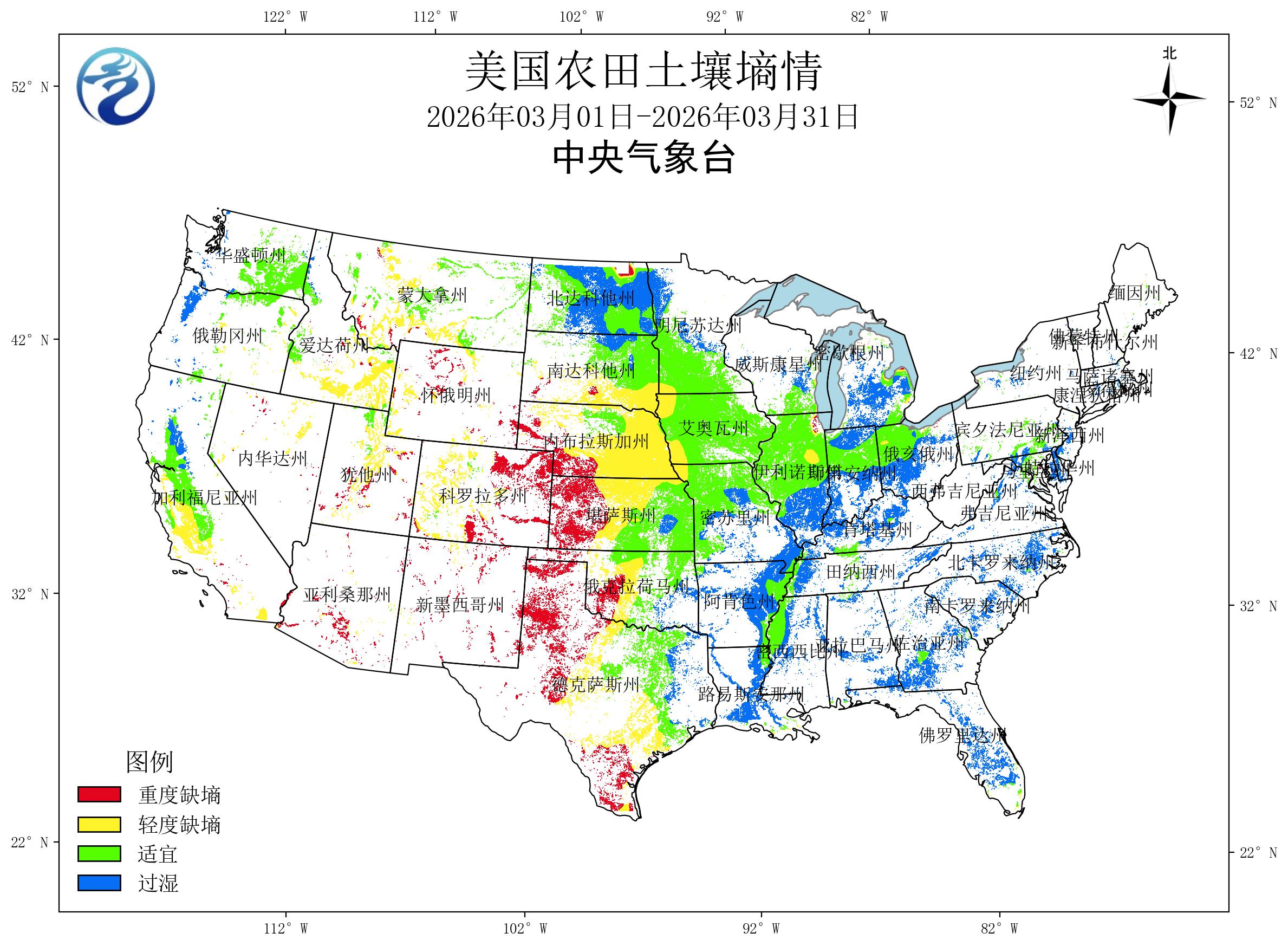 3月,美国农区大部平均气温为0~20℃,较常年同期偏高2~6℃,其中蒙大拿州、怀俄明州、科罗拉多州北部等地偏高6℃以上(图1)。西北部主产区大部降水量有10~50毫米(图2),降水有效增加麦田土壤水分,利于冬小麦返青生长,冬小麦长势良好。美国中部冬小麦主产区大部降水量不足25毫米,南达科他州、内布拉斯加州、科罗拉多州、堪萨斯州西部、德克萨斯州西部等地降水较常年同期偏少3~8成,加之气温明显偏高,土壤失墒加快,部分农田自2月以来土壤墒情持续偏差(图3),不利于冬小麦返青生长;仅堪萨斯州东部、俄克拉荷马州东部、德克萨斯州东部等地降水量有25~50毫米,降水有效补充了土壤水分,对冬小麦返青生长有利。