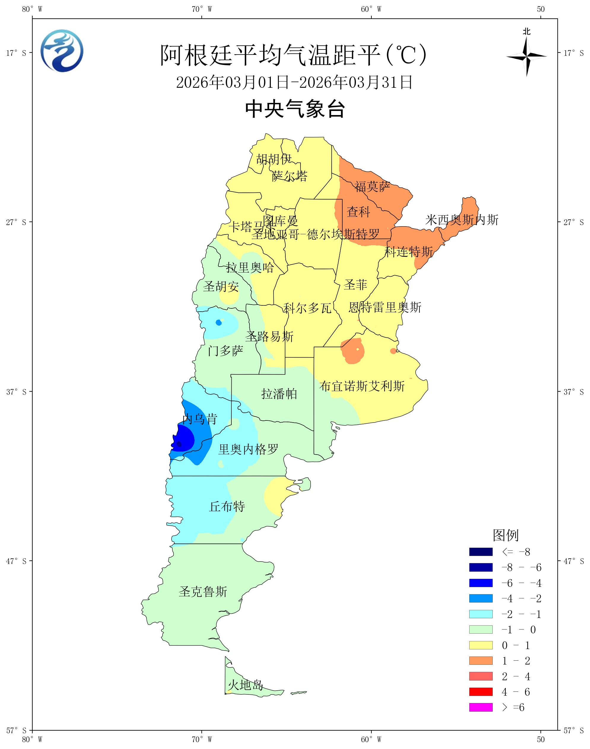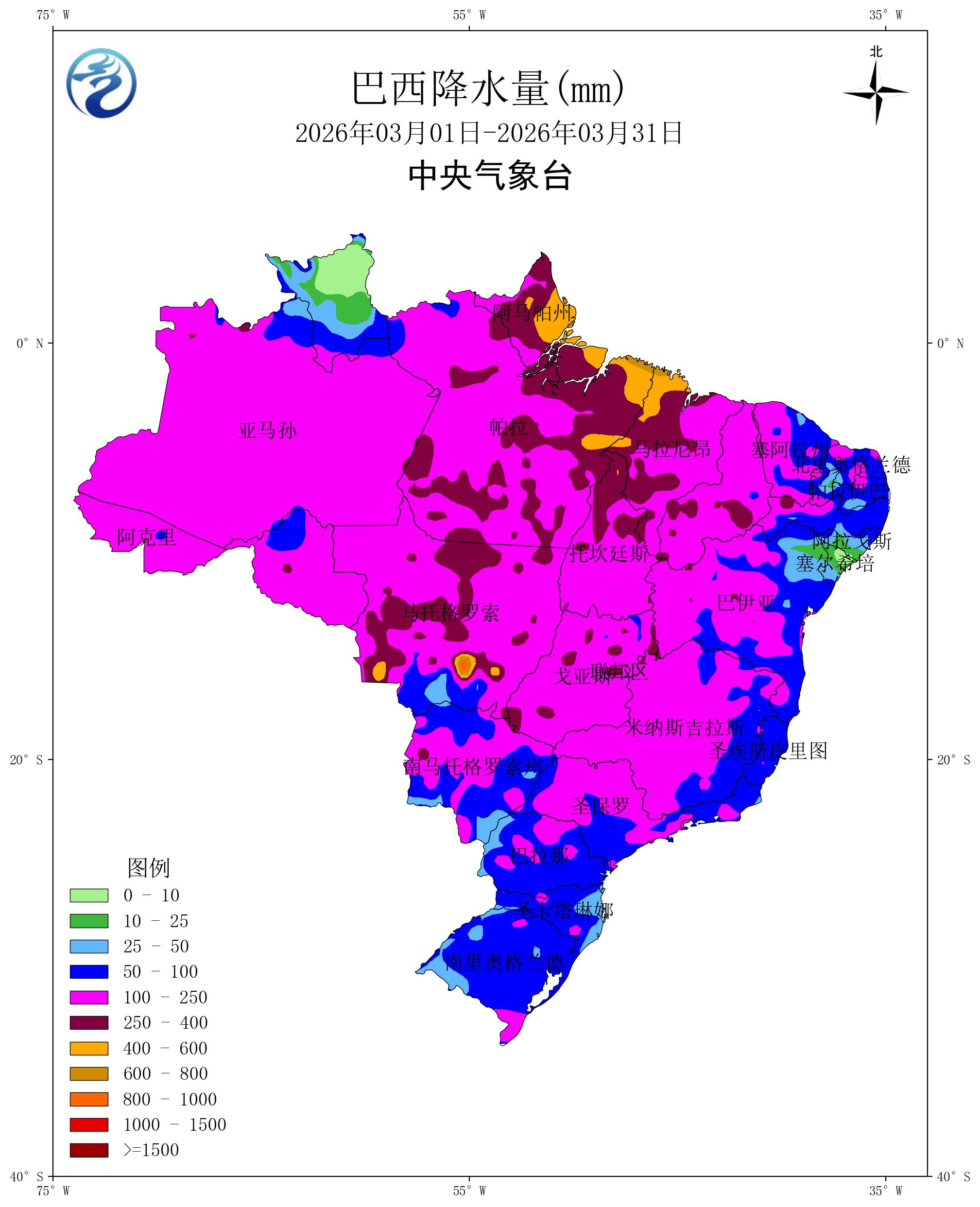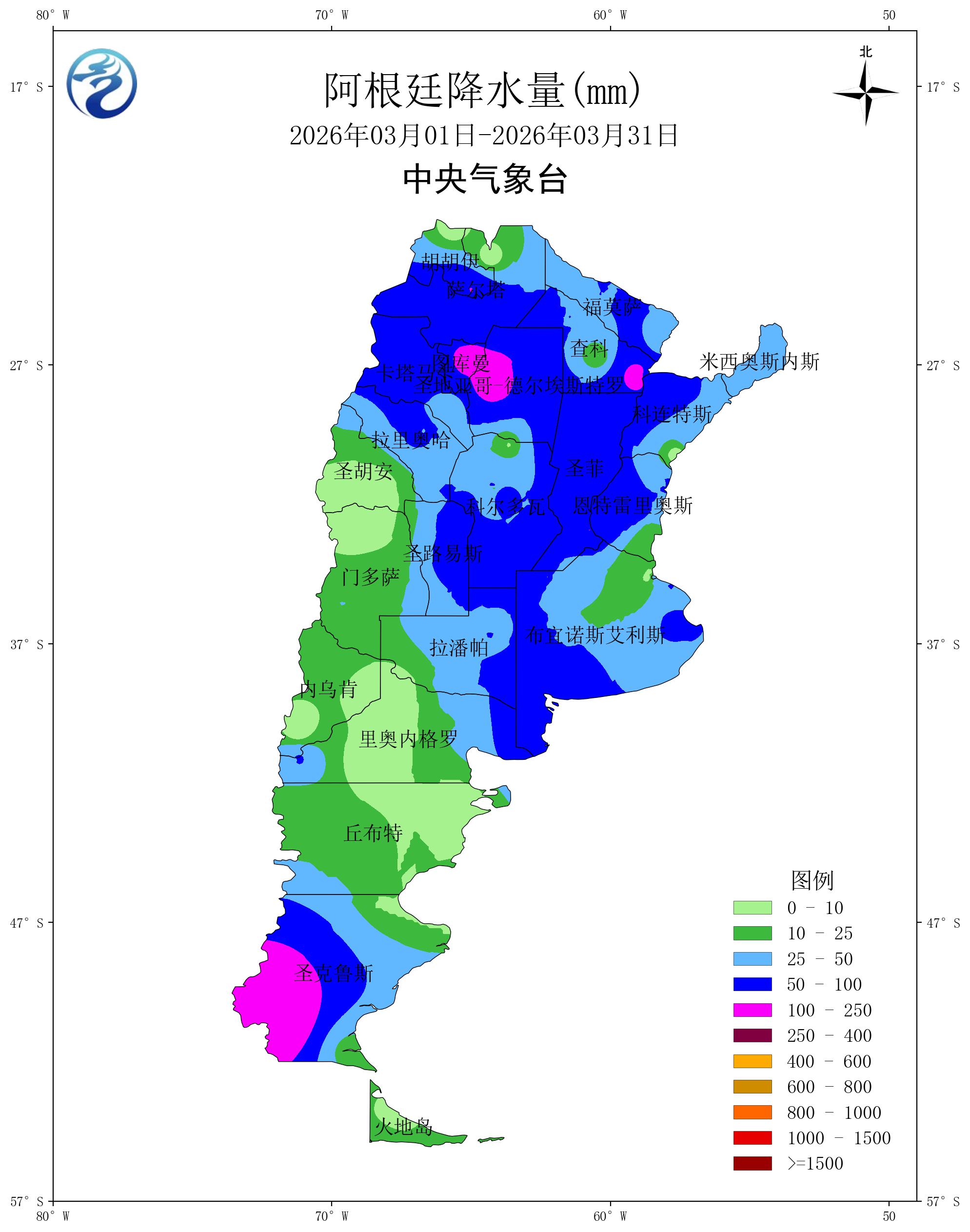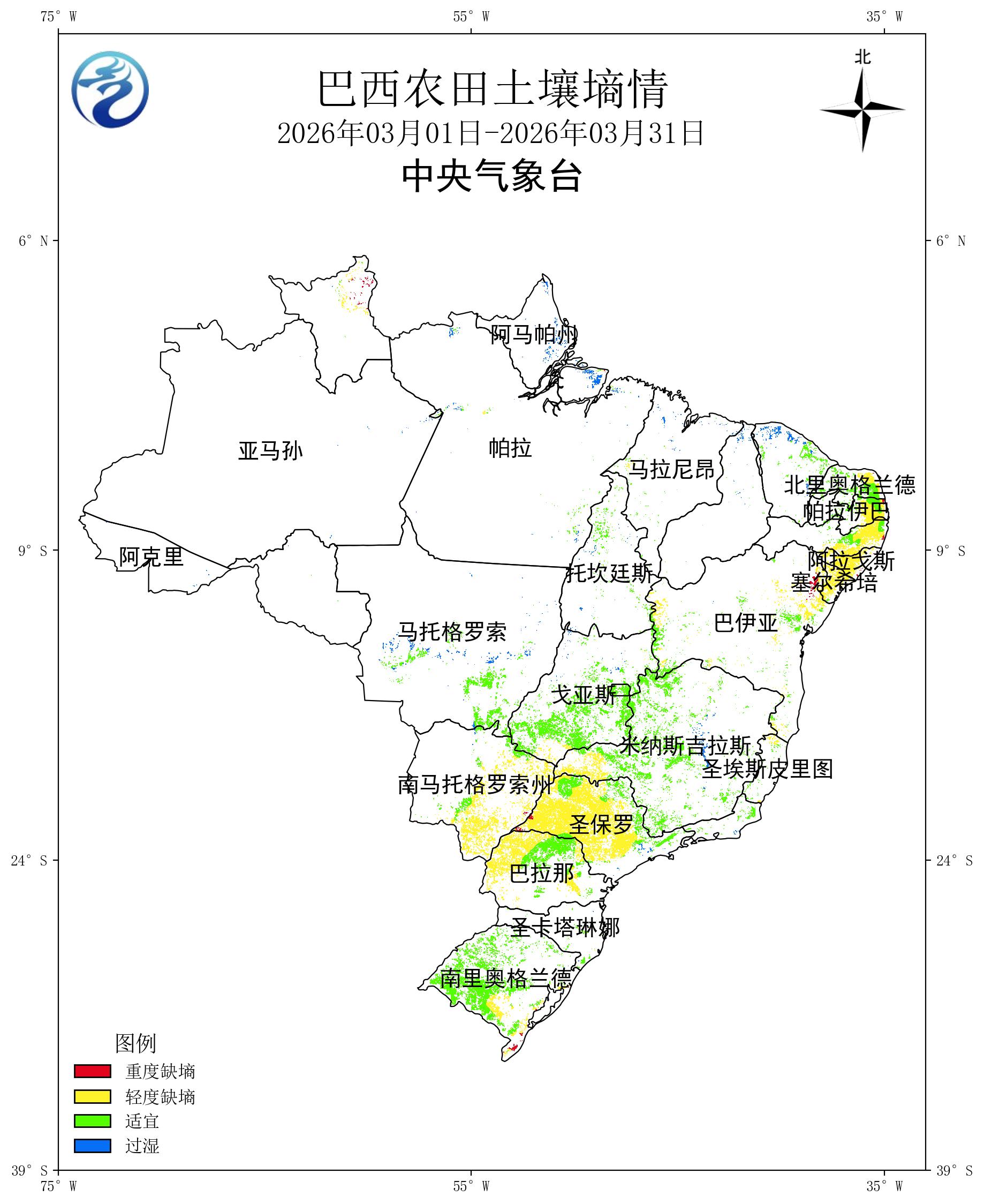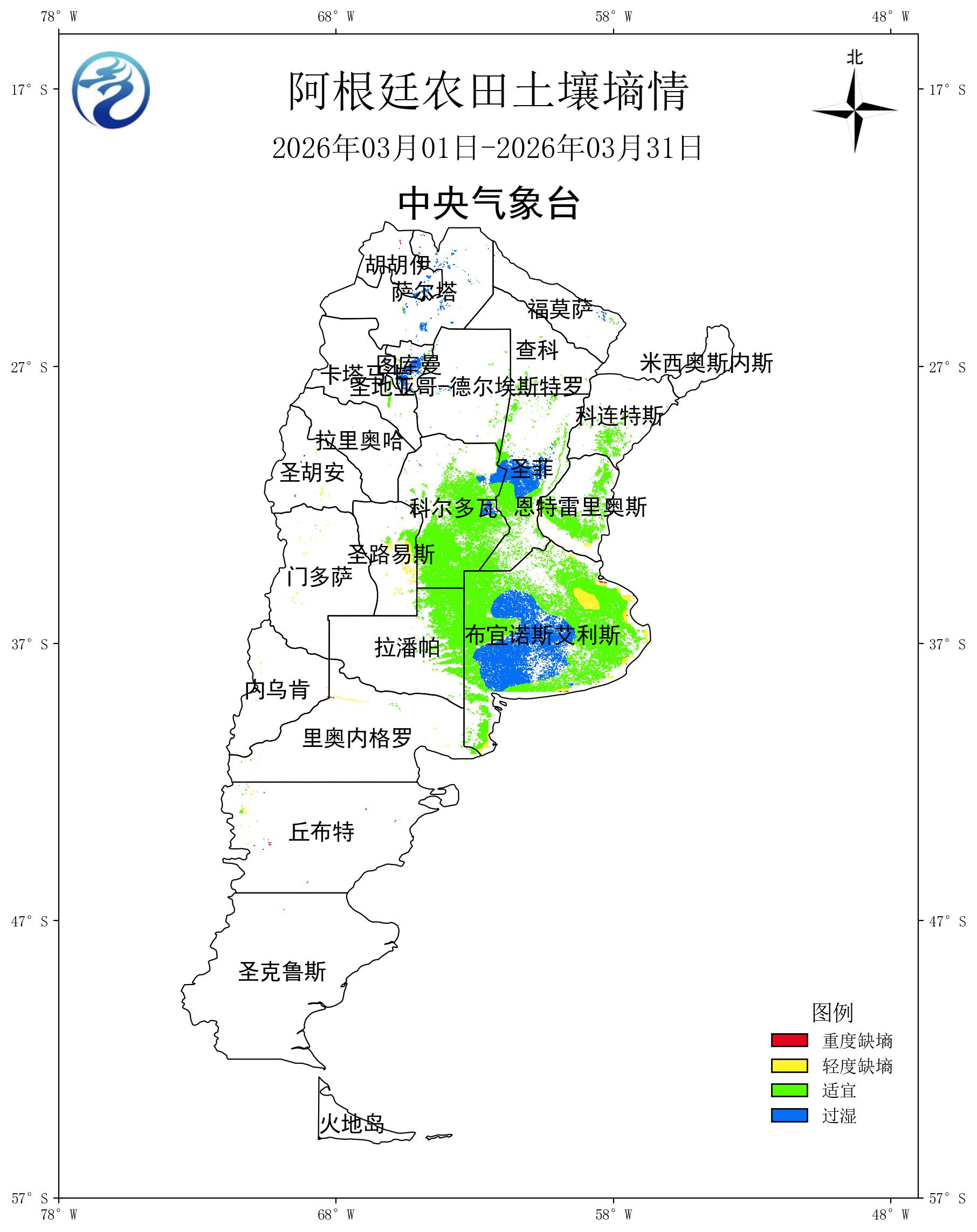 阿根廷大豆和玉米主产区大部气温接近常年同期(图7),前半月高温少雨,布宜诺斯艾利斯东部部分地区农田缺墒,对处于灌浆成熟期的头季玉米和大豆产量形成不利,但晴好天气利于棉花采摘;后半月中北部农区出现大范围降水,月降水量有25~100毫米(图8),土壤水分得到有效补充,农田墒情改善,大部农田墒情适宜(图9),水热条件利于头季玉米、大豆充分灌浆和乳熟成熟,同时也对二季玉米播种出苗非常有利。截至3月底,阿根廷玉米和棉花分别已收获23%和14%。
