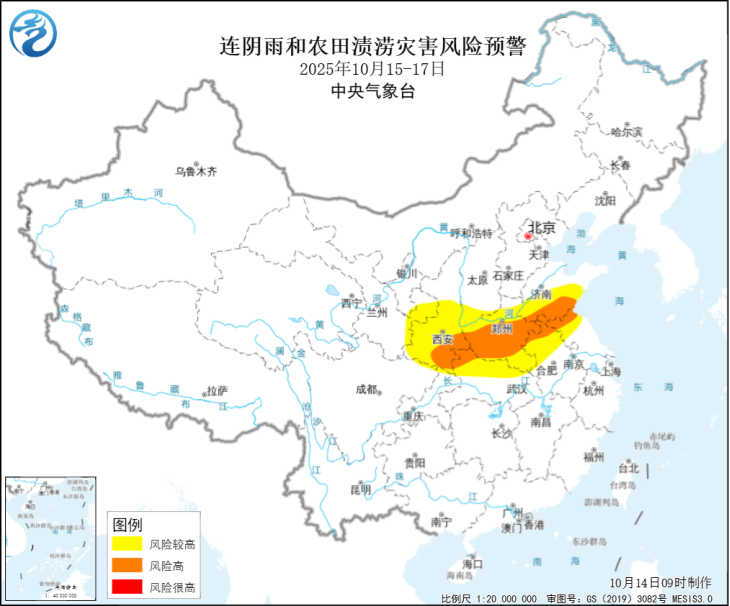 农业农村部和中国气象局10月14日联合发布连阴雨和农田渍涝灾害风险预警:预计10月15-17日,陕西中南部、华北西南部、黄淮、江汉等地将有中到大雨,局地有暴雨,甘肃陇东、陕西中南部、山西西南部、河南大部、山东中南部、江苏北部、安徽北部、湖北北部等地连阴雨和农田渍涝风险较高(黄色预警),其中陕西东南部、河南中部、山东南部、湖北西北部、江苏北部和安徽北部部分地区风险高(橙色预警)。建议上述地区避雨抢收,采取通风存储、烘干等措施,降低发芽霉变风险;及时排涝降渍,腾茬整地,适时适墒播种。
