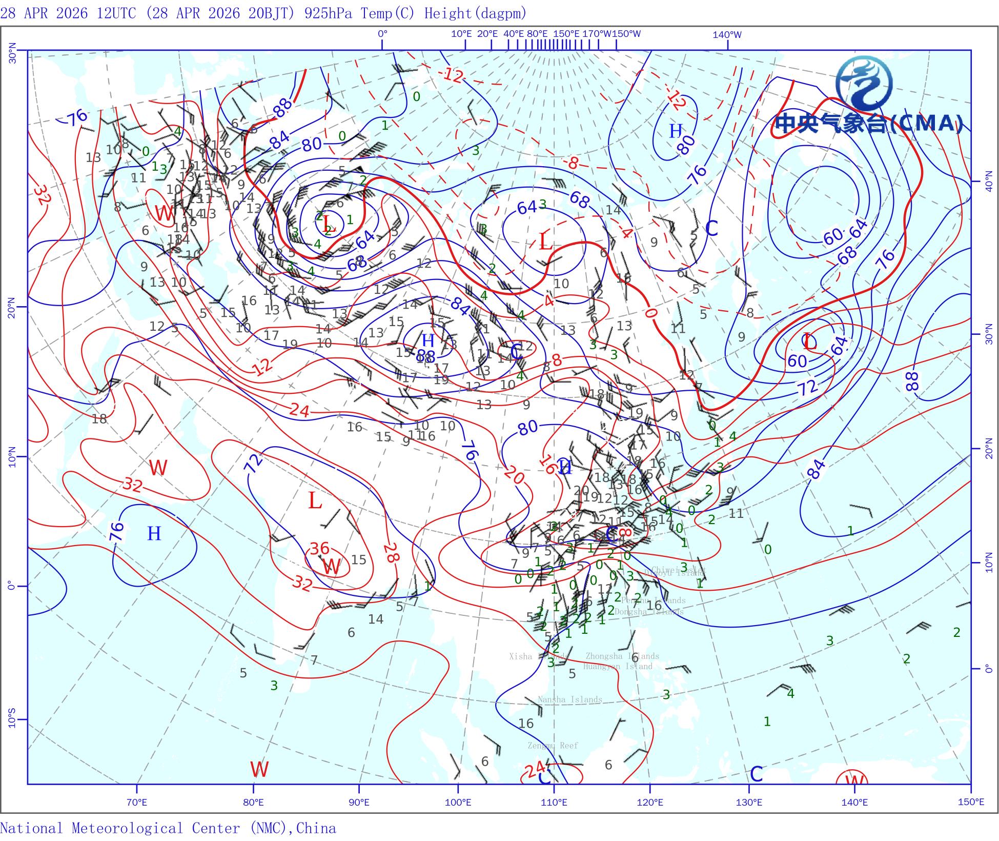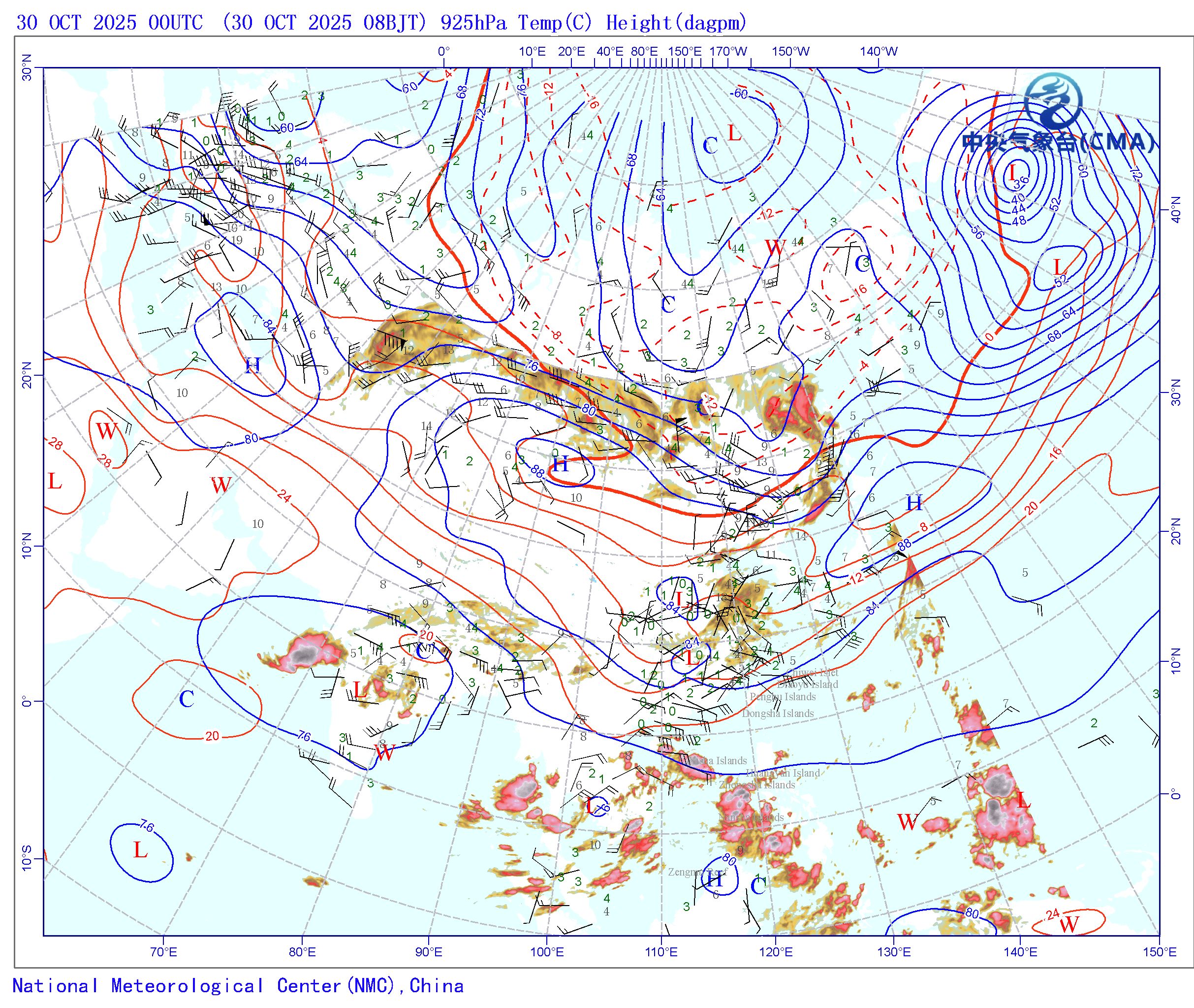 站点的填图要素包括:风向风速和温度露点差;天气系统符号包括:高压中心(H)、低压中心(L)、暖中心(W)、冷中心(C)和台风符号;蓝色等值线为等高线(单位dagpm);红色等值线为等温线(单位℃),其中零摄氏度以下以虚线显示。底层填色为地形高度;顶层填色为红外卫星云图。