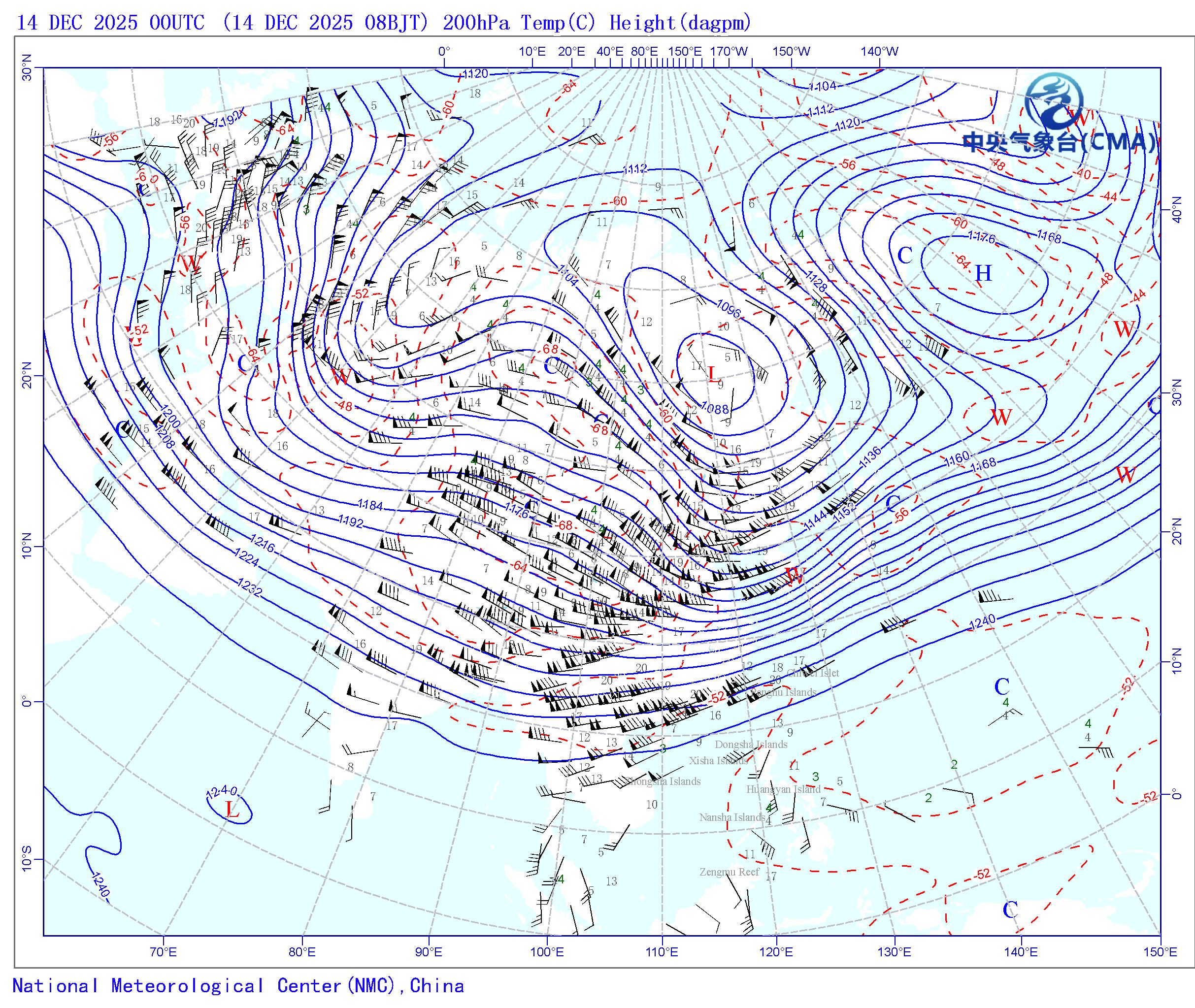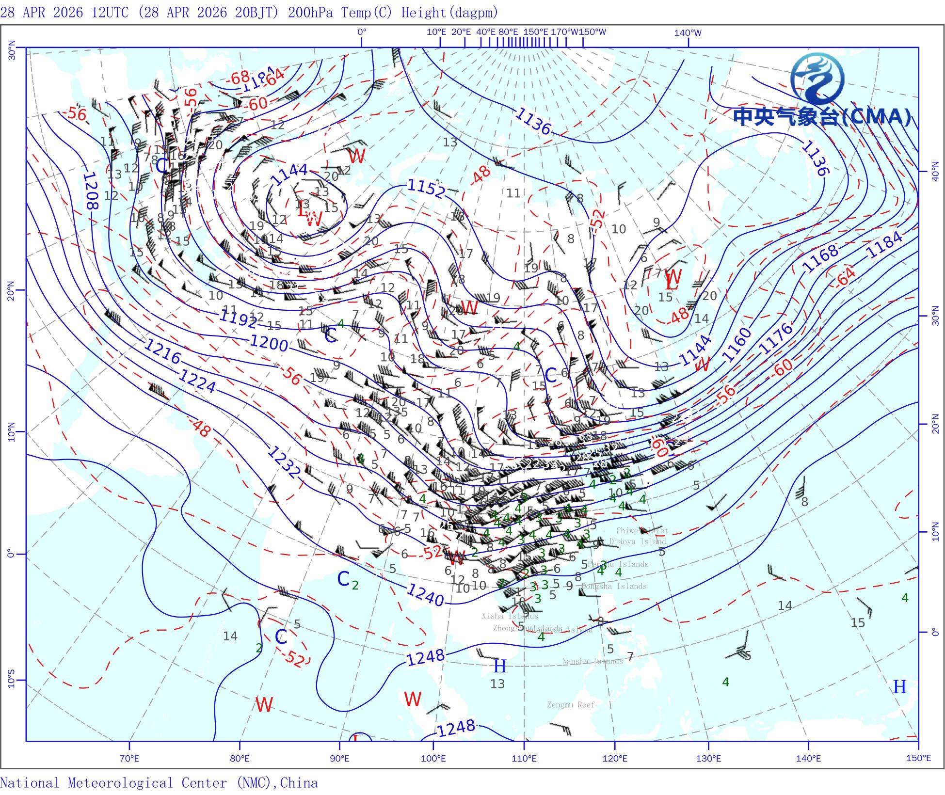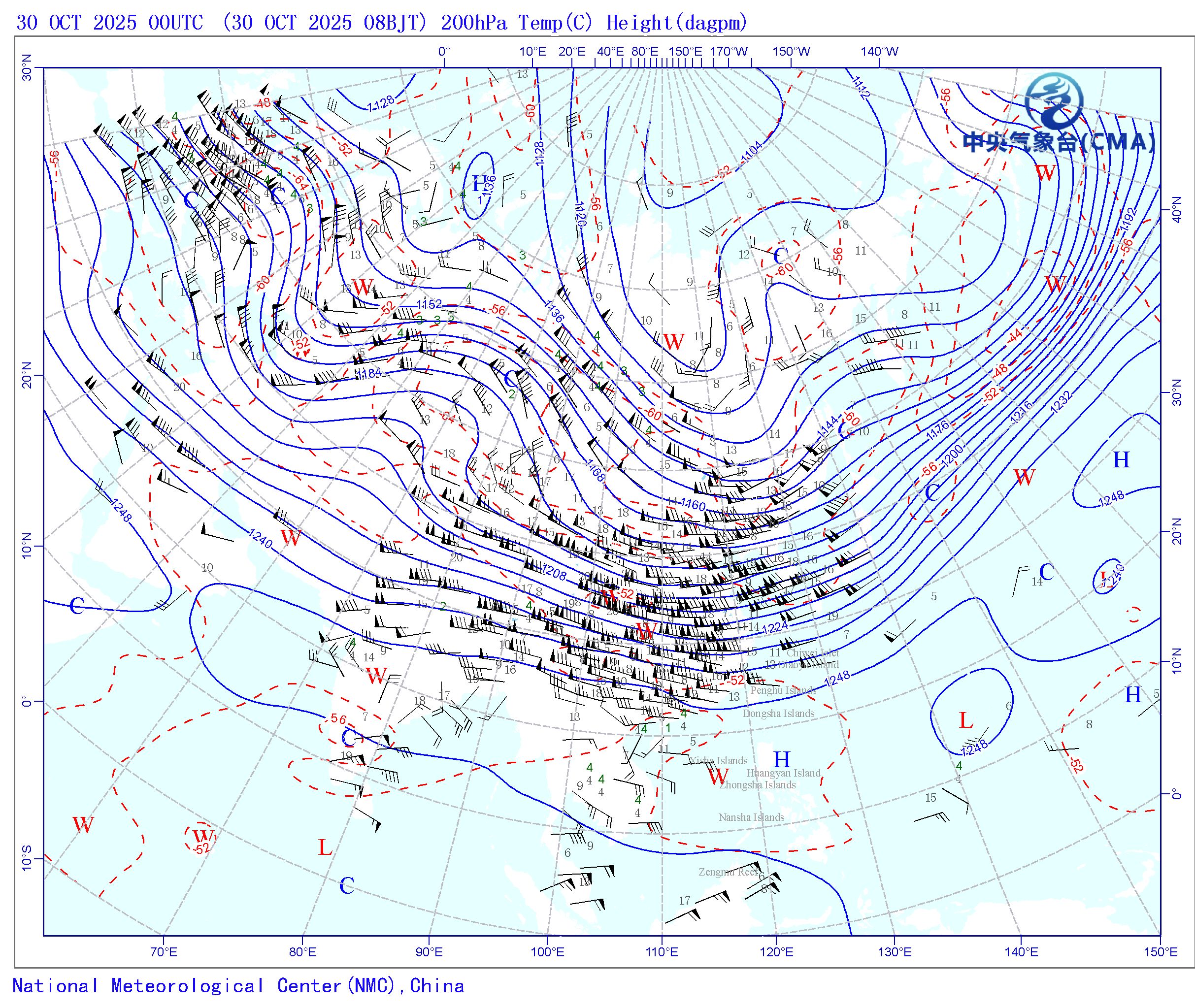 站点的填图要素包括:风向风速和温度露点差;天气系统符号包括:高压中心(H)、低压中心(L)、暖中心(W)、冷中心(C)和台风符号;蓝色等值线为等高线(单位dagpm);红色等值线为等温线(单位℃),其中零摄氏度以下以虚线显示。