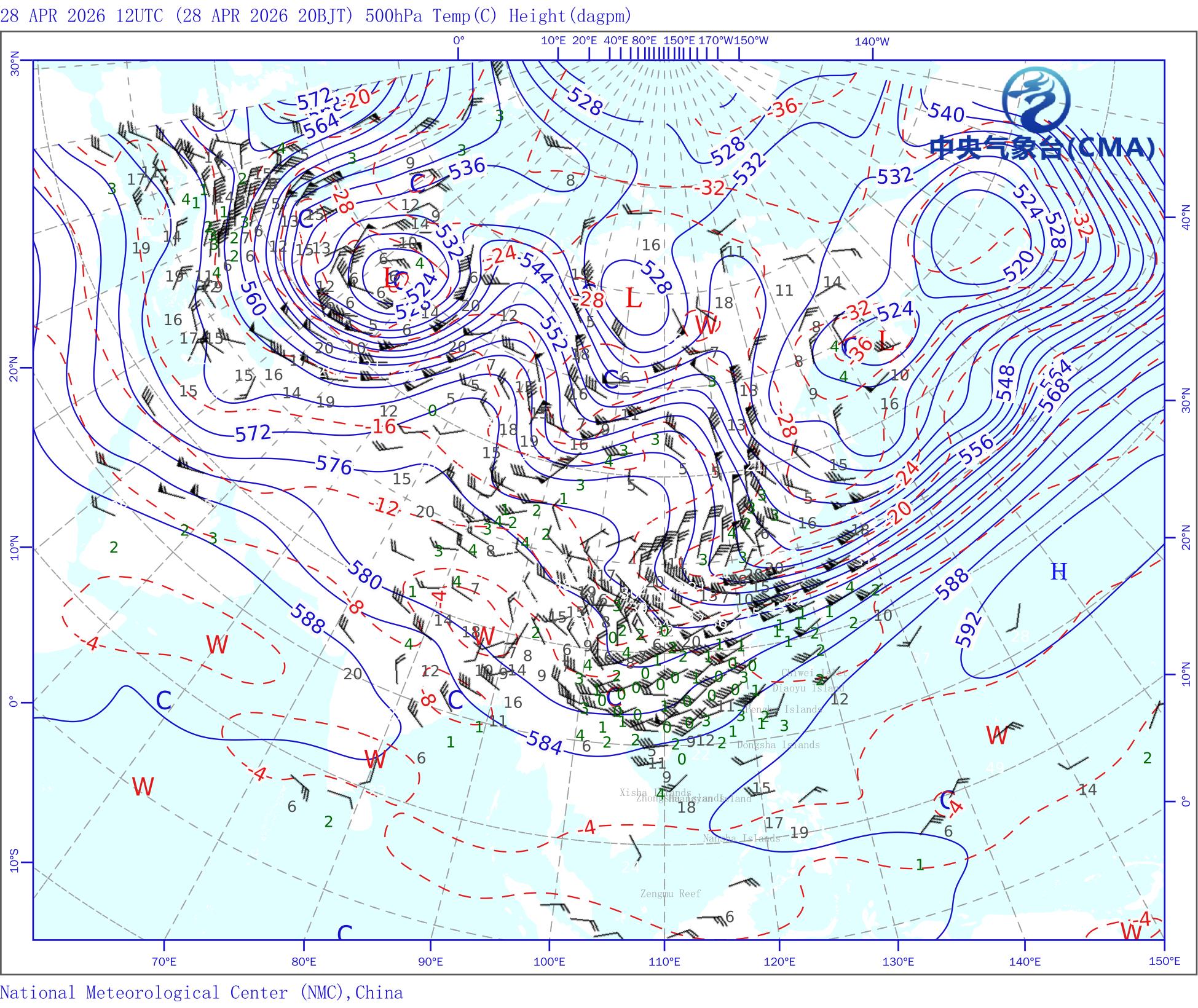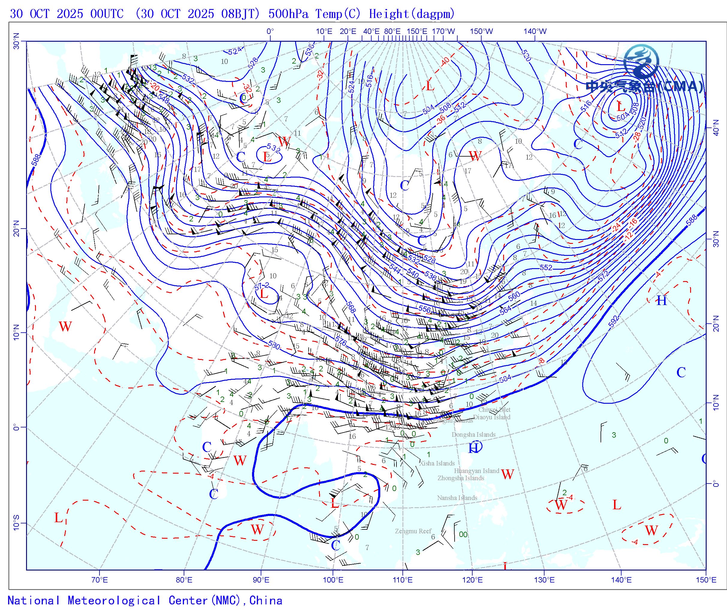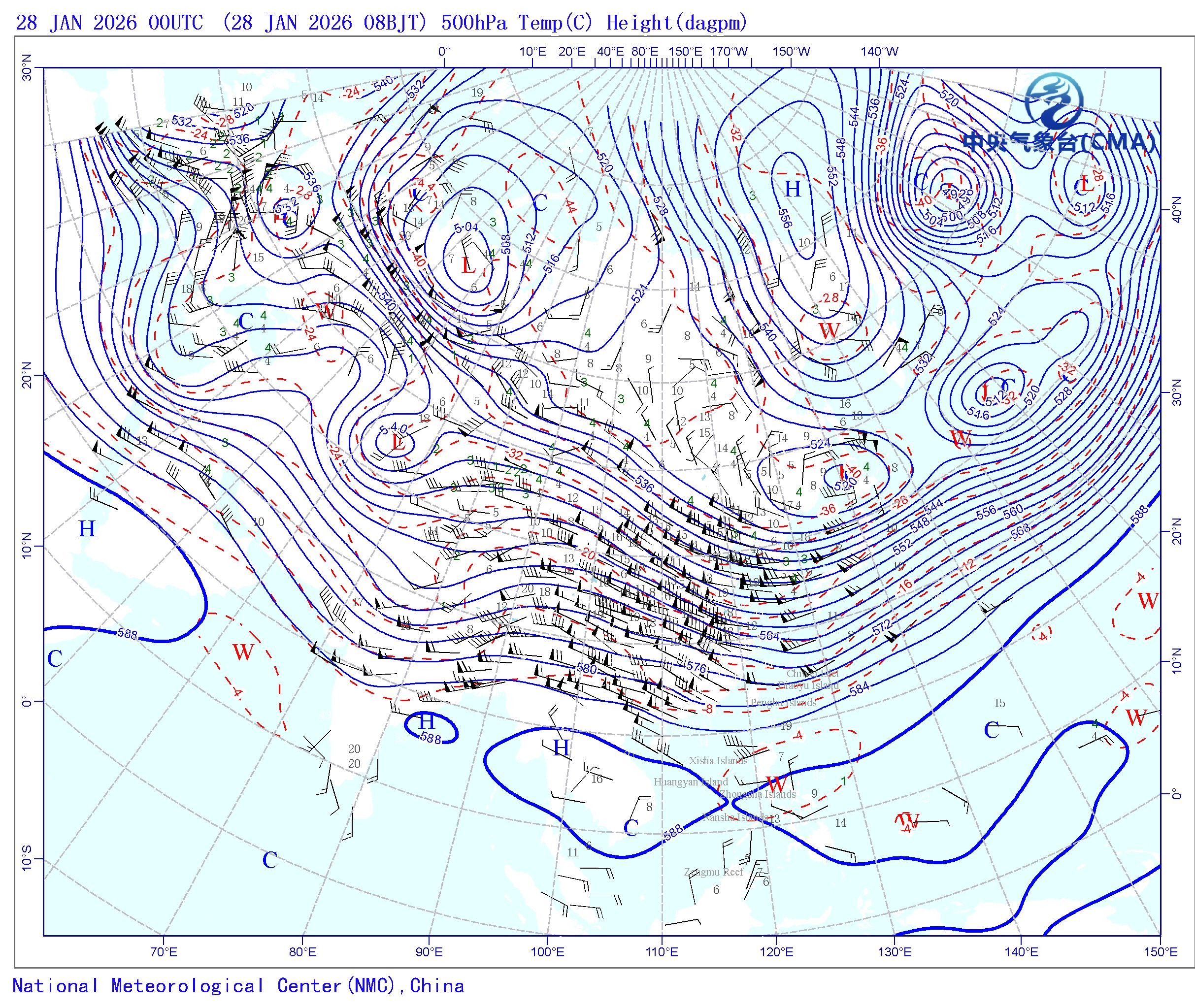 站点的填图要素包括:风向风速和温度露点差;天气系统符号包括:高压中心(H)、低压中心(L)、暖中心(W)、冷中心(C)和台风符号;蓝色等值线为等高线(单位dagpm);红色等值线为等温线(单位℃),其中零摄氏度以下以虚线显示。