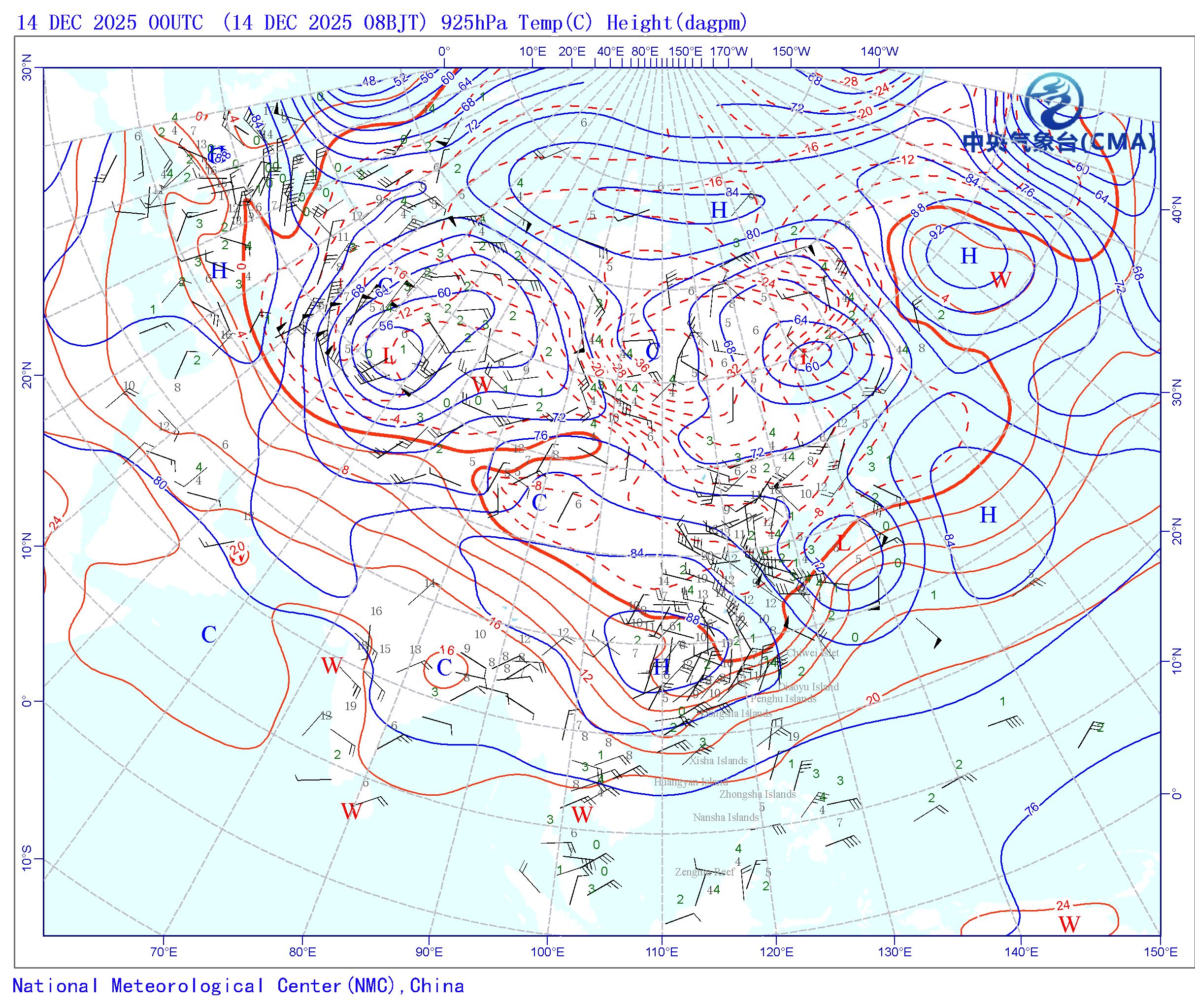 站点的填图要素包括:风向风速和温度露点差;天气系统符号包括:高压中心(H)、低压中心(L)、暖中心(W)、冷中心(C)和台风符号;蓝色等值线为等高线(单位dagpm);红色等值线为等温线(单位℃),其中零摄氏度以下以虚线显示。