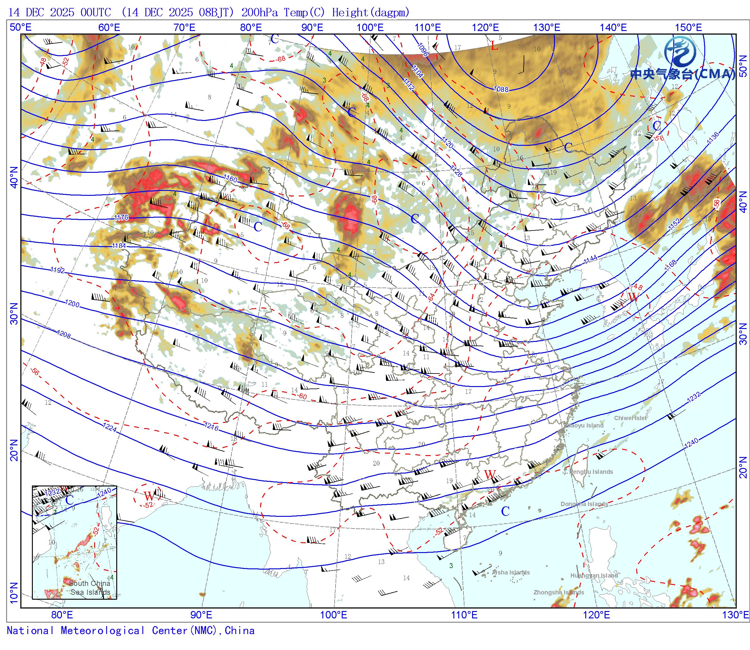 站点的填图要素包括:风向风速和温度露点差;天气系统符号包括:高压中心(H)、低压中心(L)、暖中心(W)、冷中心(C)和台风符号;蓝色等值线为等高线(单位dagpm);红色等值线为等温线(单位℃),其中零摄氏度以下以虚线显示;底层填色为地形高度;顶层填色为红外卫星云图。