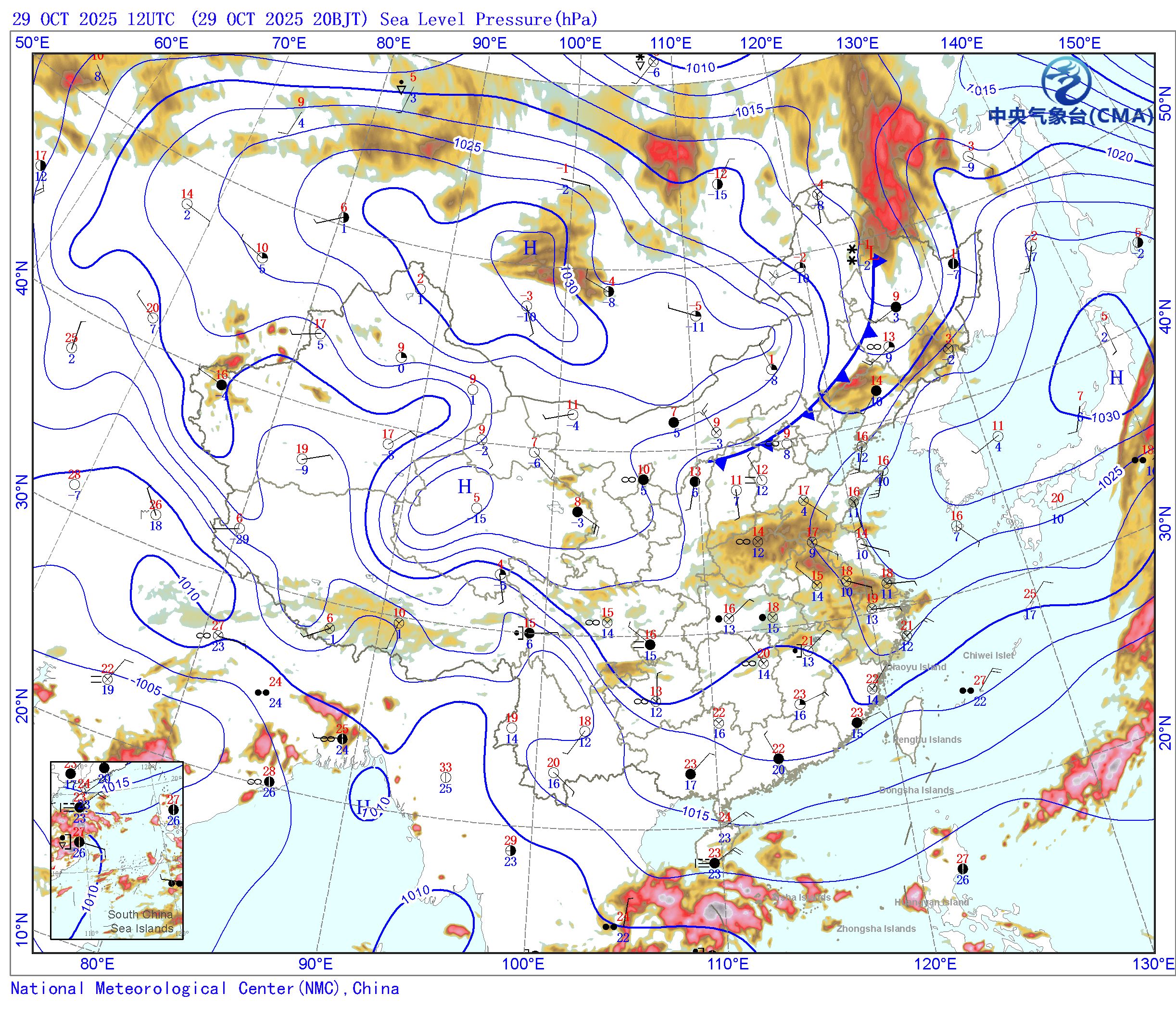 站点的填图要素包括:云量、风向风速、天气现象、温度(红色数字)和露点(蓝色数字);天气系统符号包括:高压中心(H)、低压中心(L)、冷锋(带三角形蓝色线段)、暖锋(带半圆形红色线段)和台风符号;蓝色等值线为海平面气压场等压线(单位hPa);底层填色为地形高度;顶层填色为红外卫星云图。