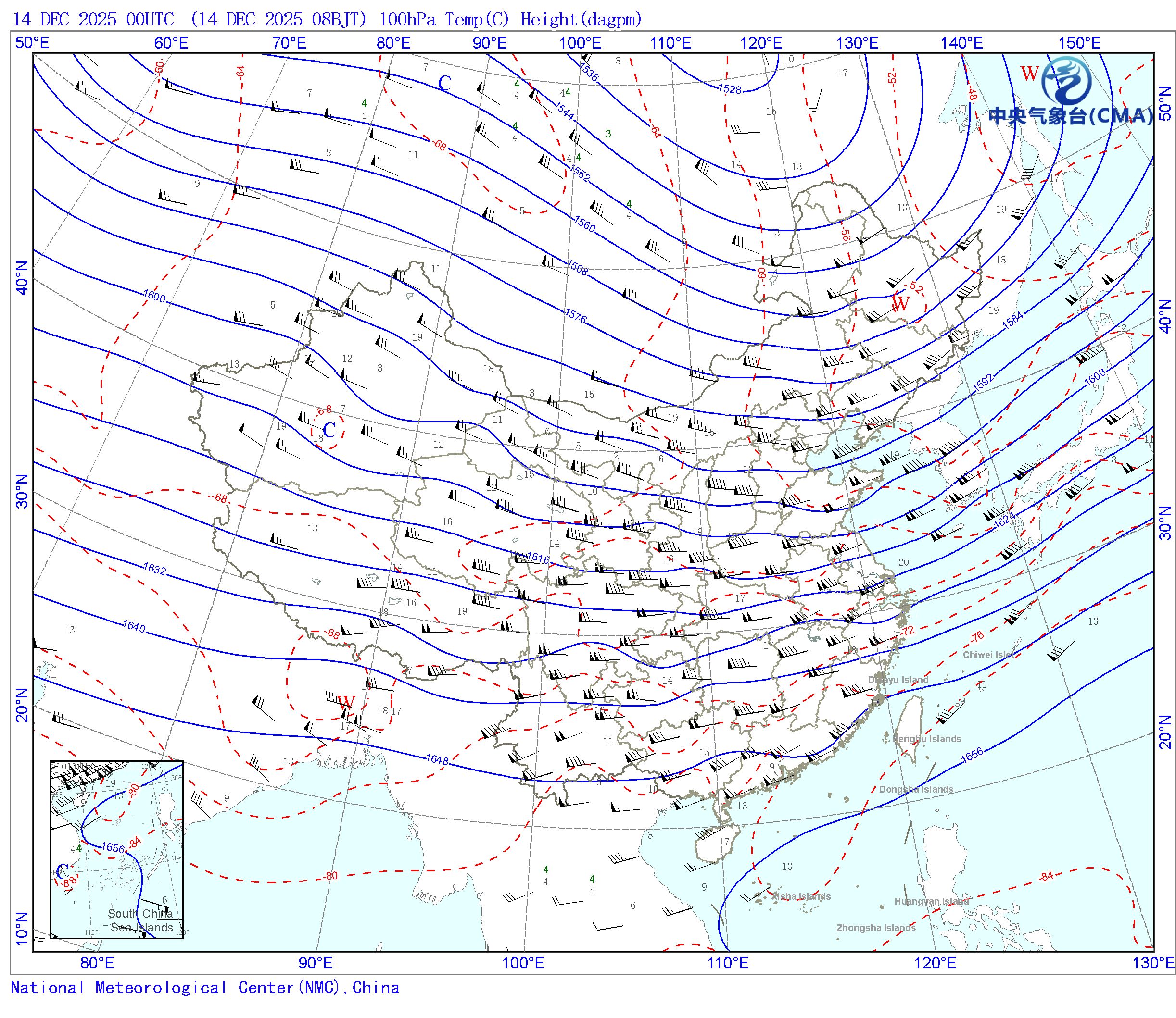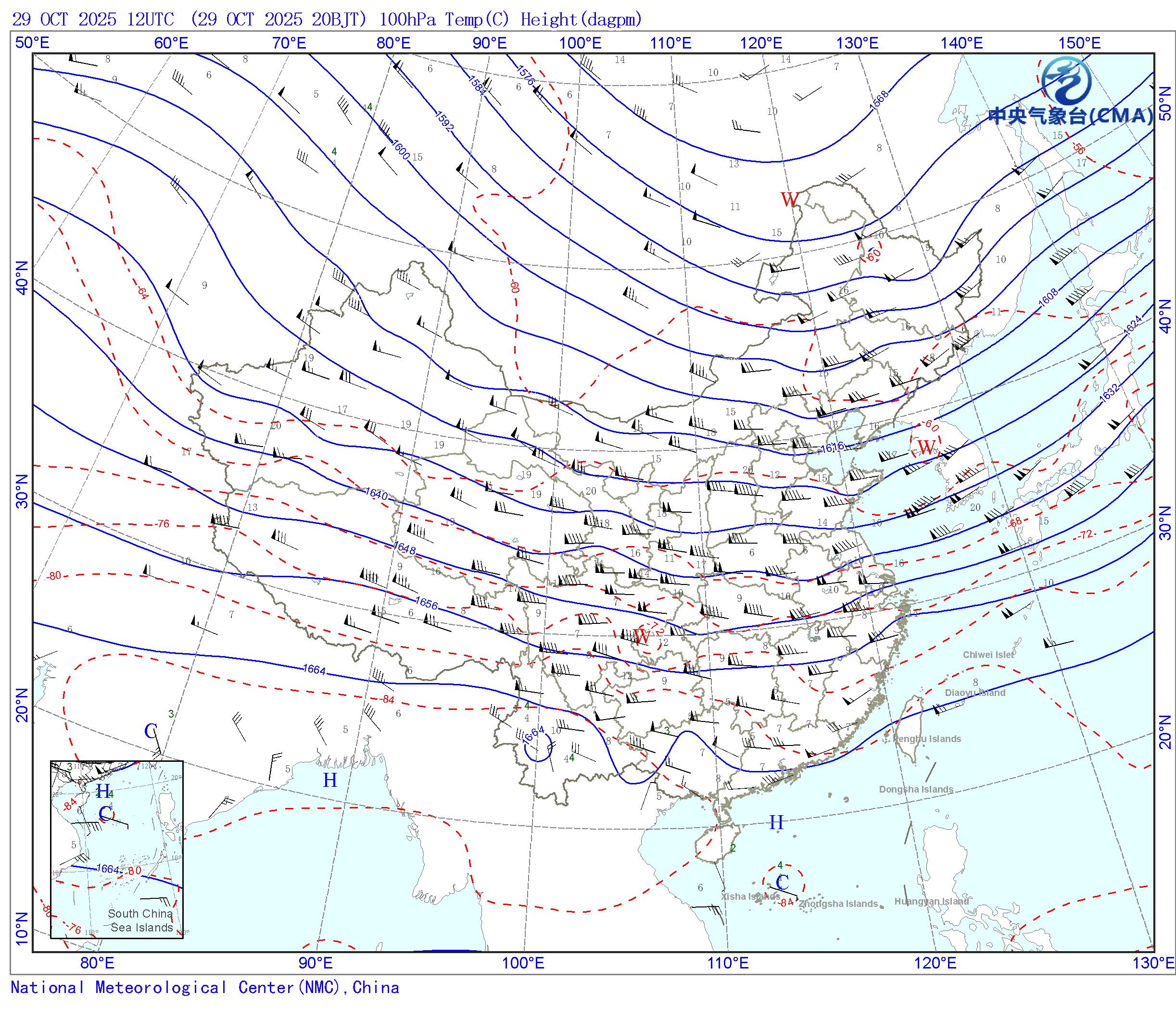 站点的填图要素包括:风向风速和温度露点差;天气系统符号包括:高压中心(H)、低压中心(L)、暖中心(W)、冷中心(C)和台风符号;蓝色等值线为等高线(单位dagpm);红色等值线为等温线(单位℃),其中零摄氏度以下以虚线显示。