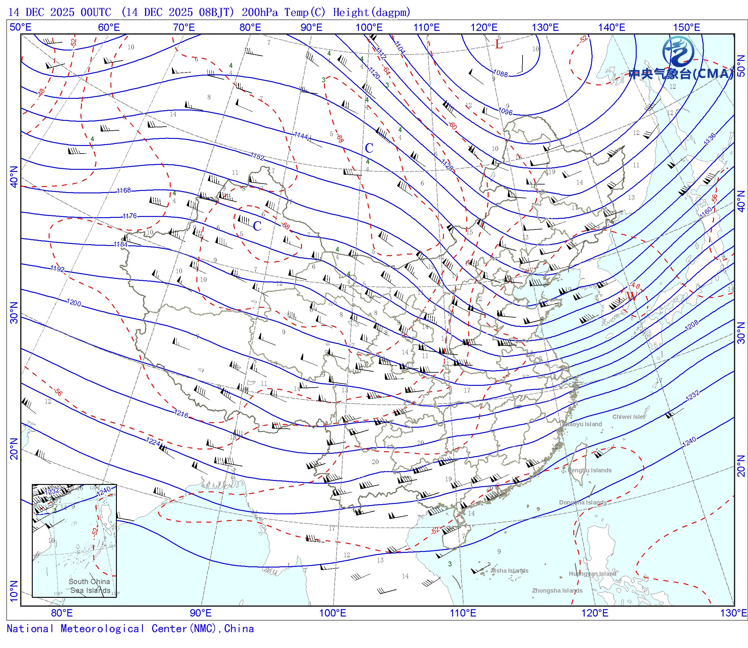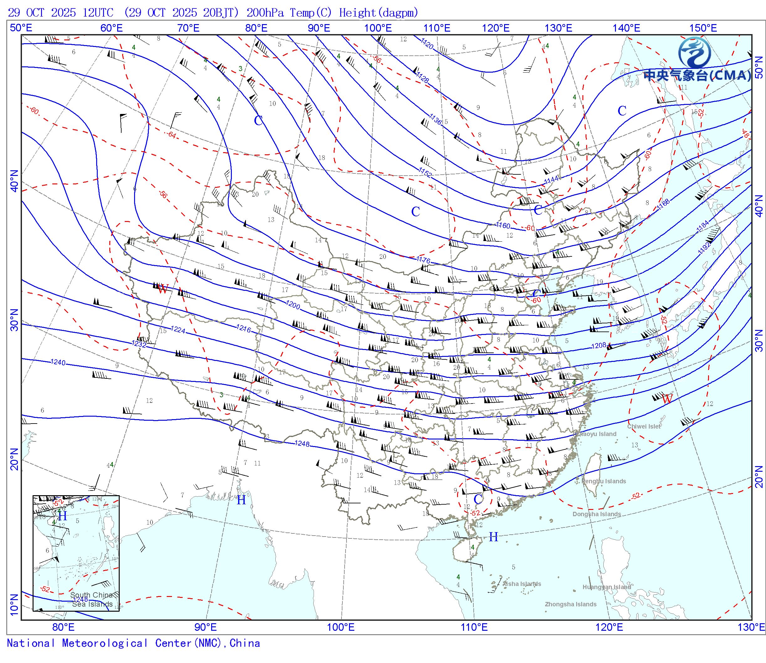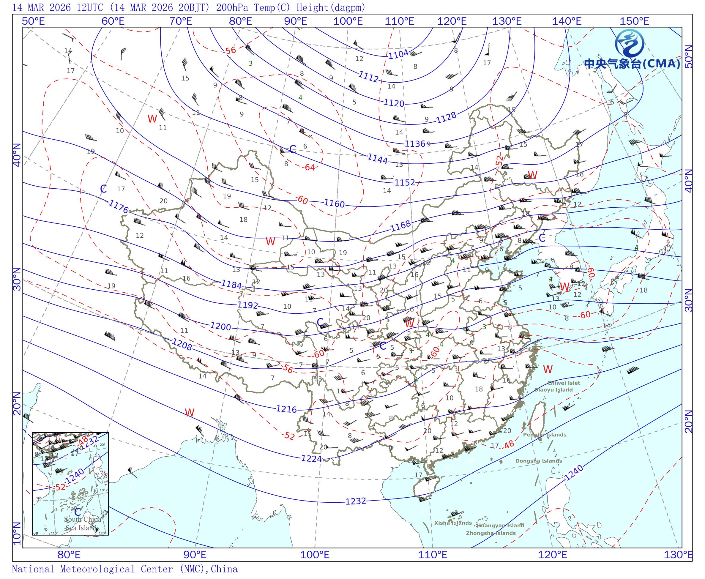 站点的填图要素包括:风向风速和温度露点差;天气系统符号包括:高压中心(H)、低压中心(L)、暖中心(W)、冷中心(C)和台风符号;蓝色等值线为等高线(单位dagpm);红色等值线为等温线(单位℃),其中零摄氏度以下以虚线显示。