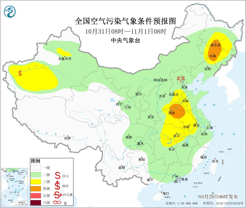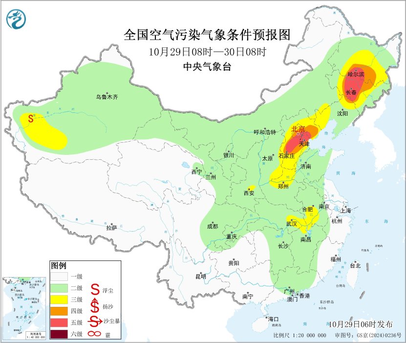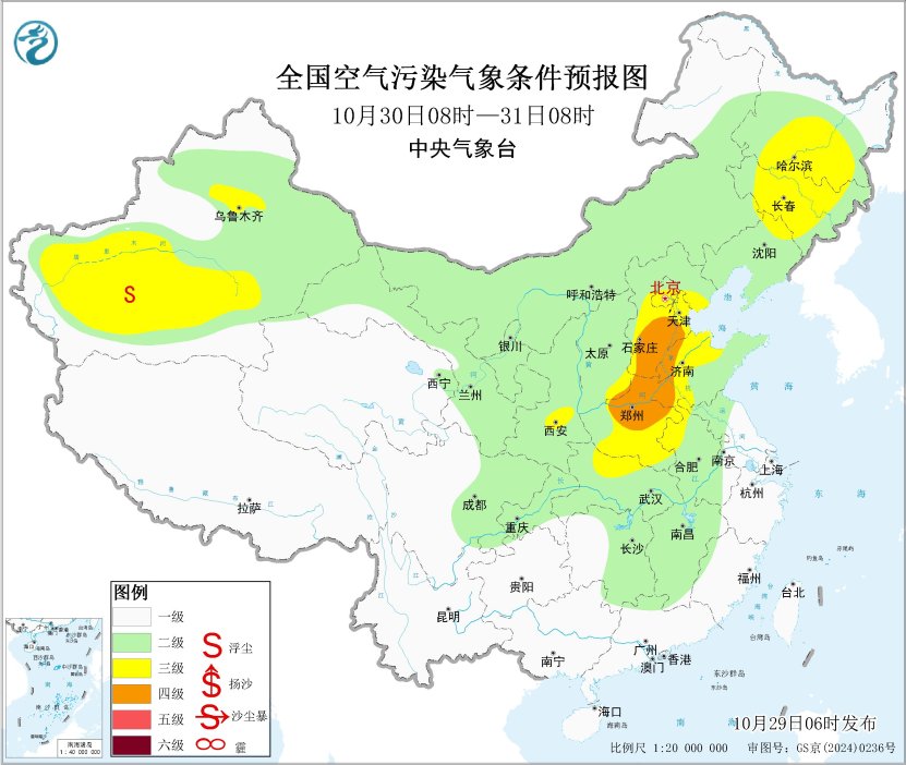 10月29日早晨至上午,北京、天津、河北、甘肃东部、陕西中北部、河南北部、山东西北部、湖北中西部、贵州东部和西部、湖南北部等地的部分地区有大雾天气,其中北京南部、天津北部、河北中南部、河南北部等地的部分地区有能见度不足500米的浓雾,局地有能见度不足200米的强浓雾。中央气象台29日06时继续发布大雾黄色预警。