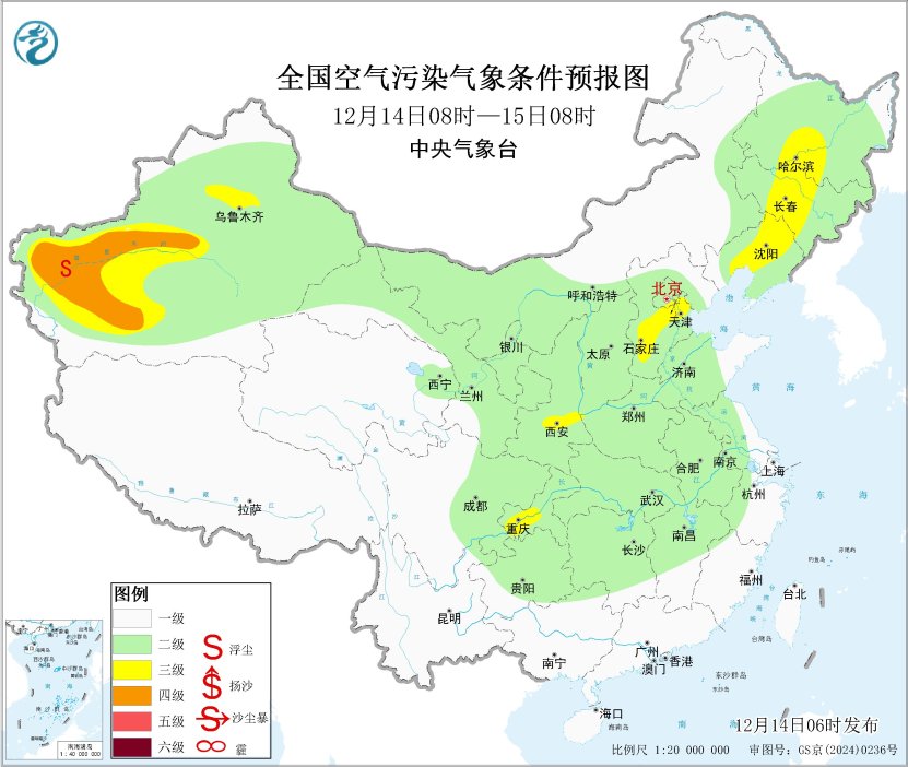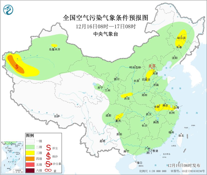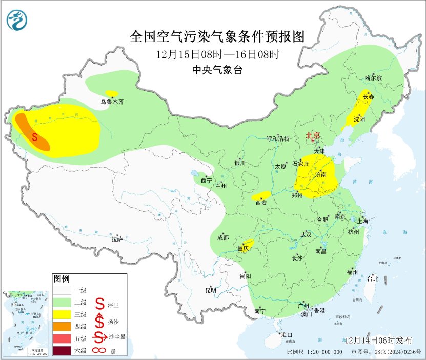 14日,受冷空气影响,区域大部大气扩散条件较好。15日至20日,区域中南部大气扩散条件偏差,有阶段性雾霾过程。