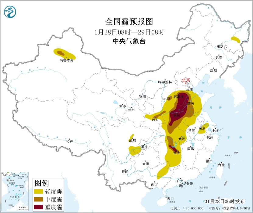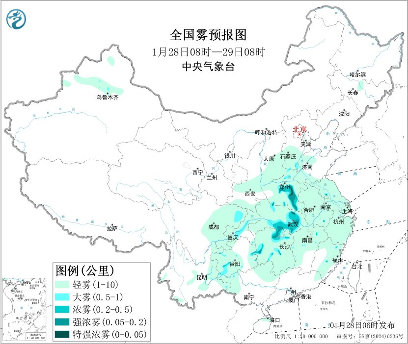 28日至29日,湖北中东部、湖南中北部等地大气扩散条件一般,有轻至中度霾。此外,28日早晨至上午,湖北中东部、湖南中北部等地的部分地区有大雾,局地有能见度不足50米的特强浓雾。