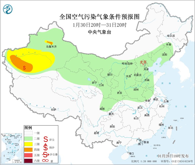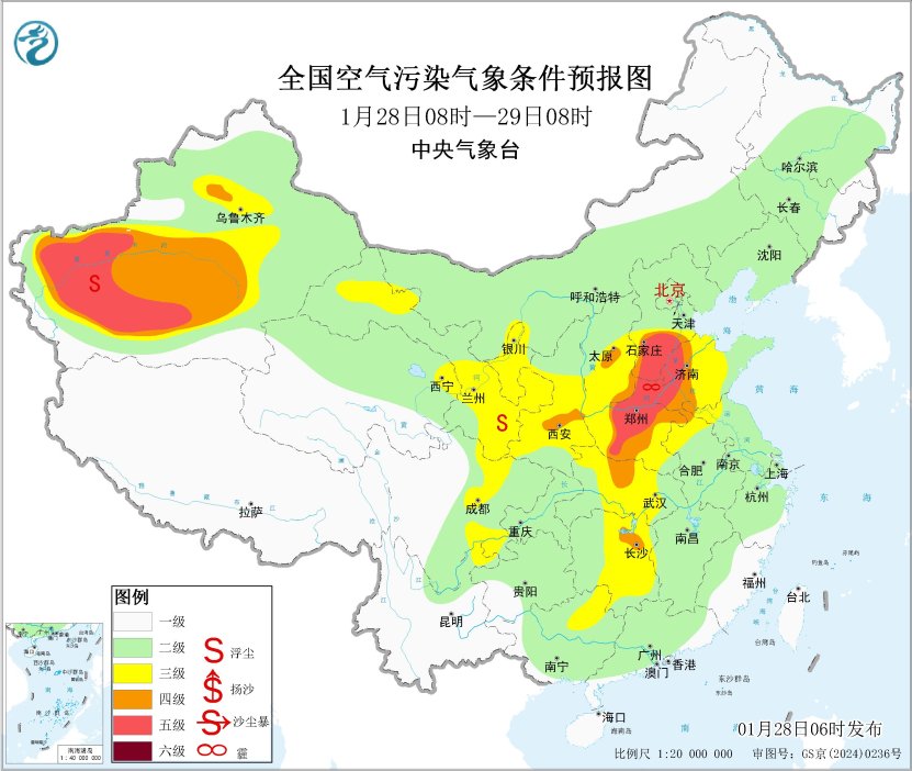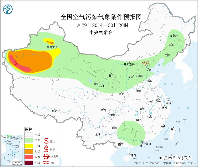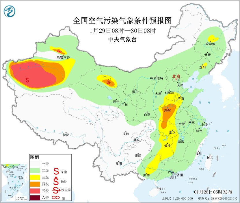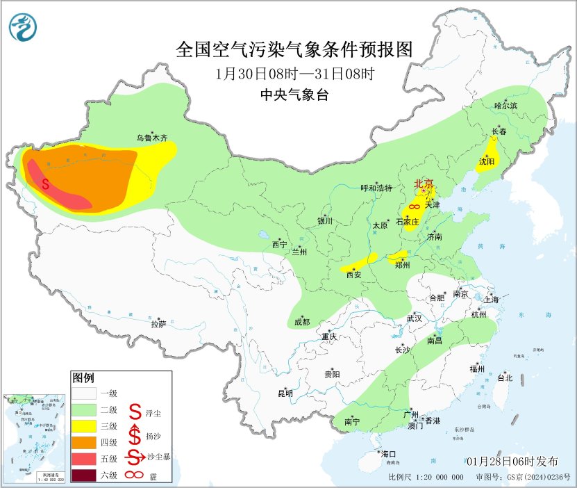28日,华北中南部、黄淮中西部、汾渭平原、江汉等地大气扩散条件较差,有轻至中度霾,部分地区有重度霾,早晨至上午时段部分地区有大雾。29日至30日,受冷空气和降水共同影响,上述地区雾、霾天气逐渐减弱或消散。