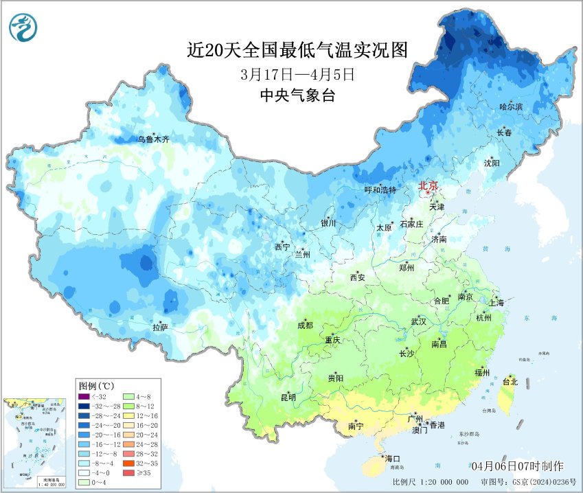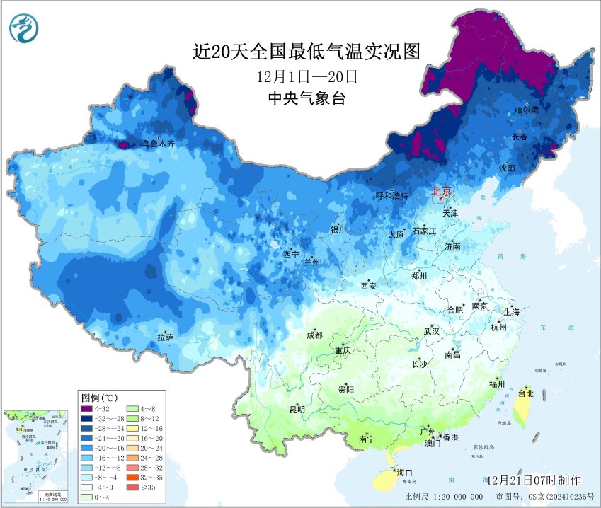 近20天全国最低气温实况图