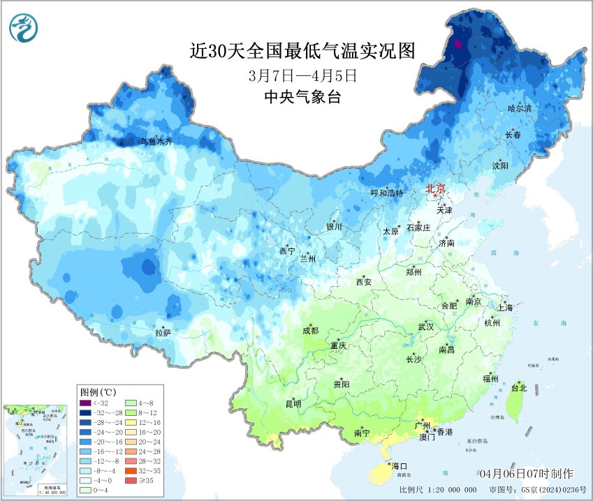 近30天全国最低气温实况图