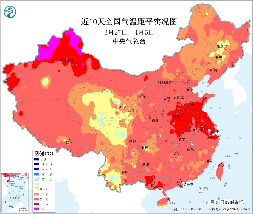 近20天全国平均气温距平图
