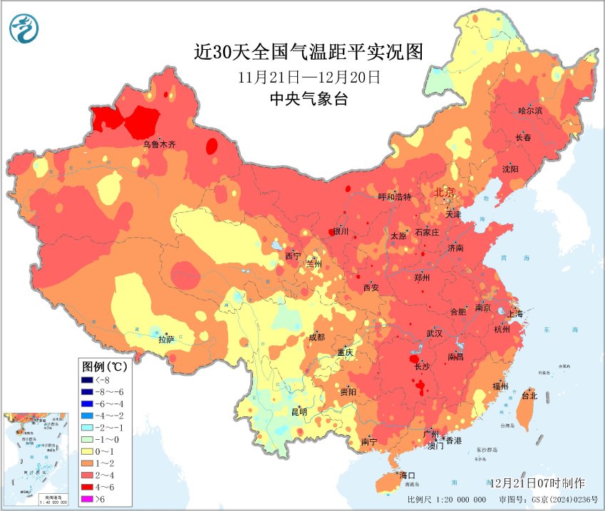 近30天全国平均气温距平图