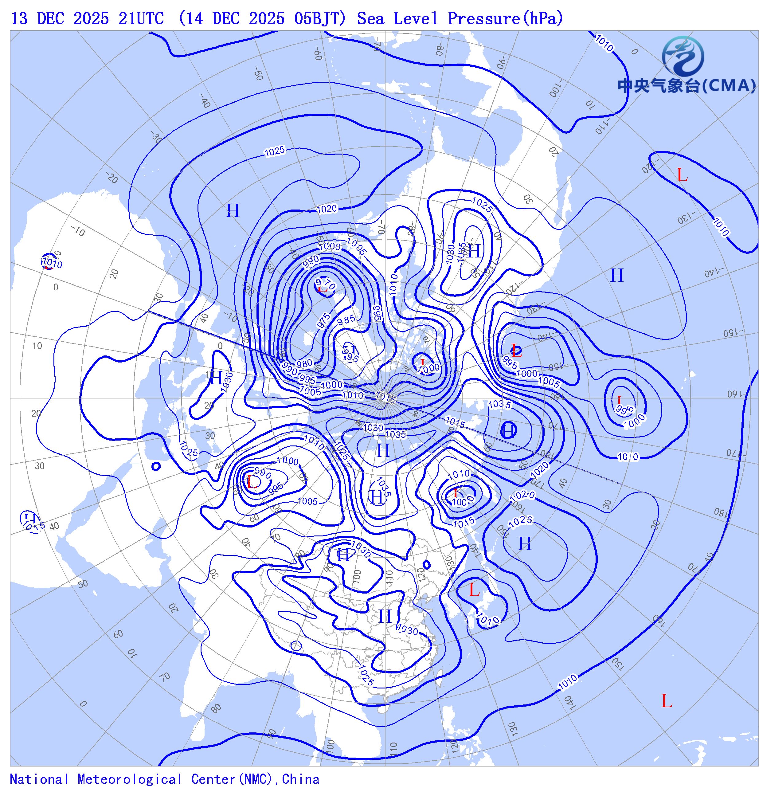 天气系统符号包括:高压中心(H)、低压中心(L)和台风符号;蓝色等值线为海平面气压场等压线(单位hPa)。