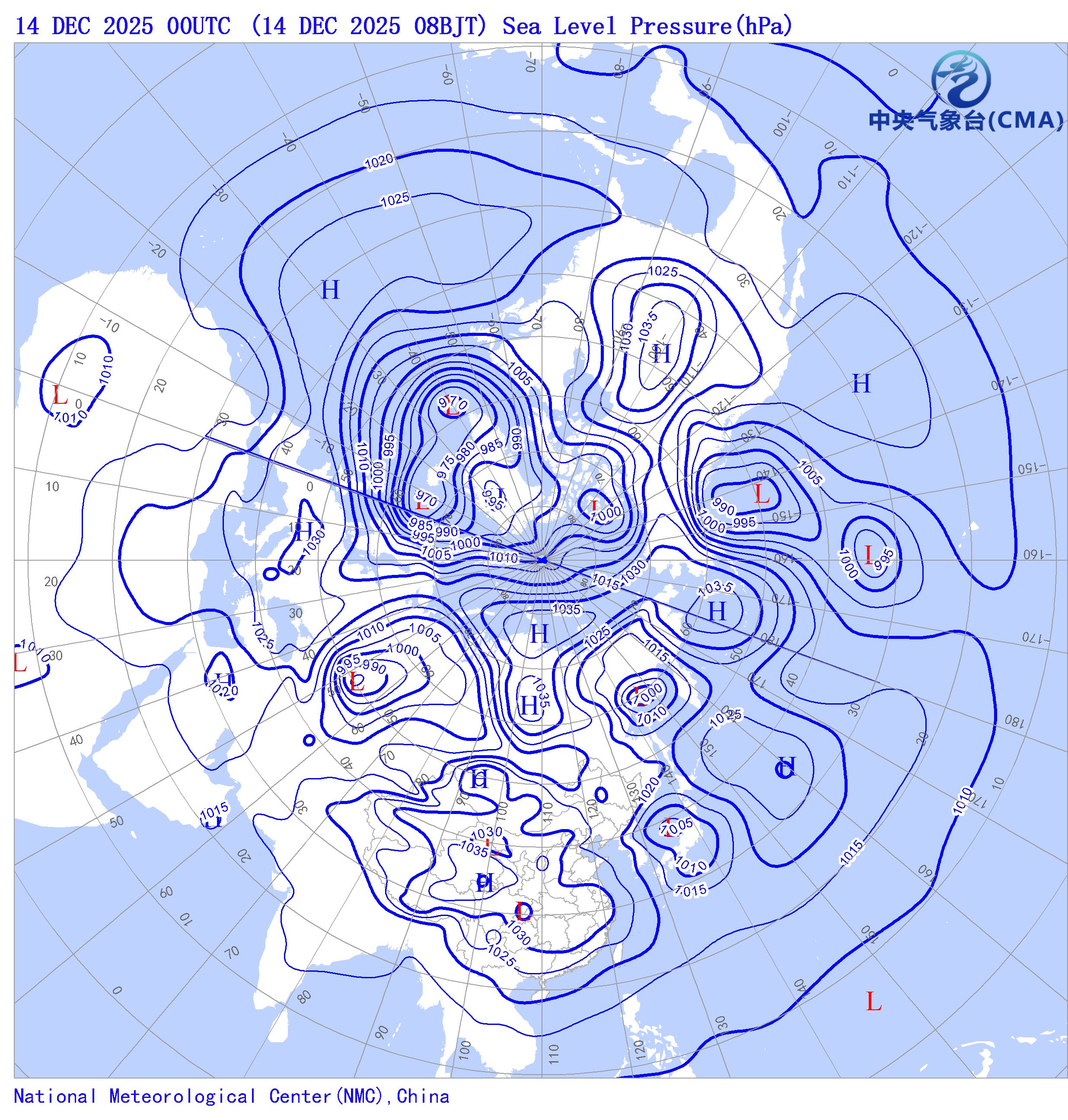 天气系统符号包括:高压中心(H)、低压中心(L)和台风符号;蓝色等值线为海平面气压场等压线(单位hPa)。