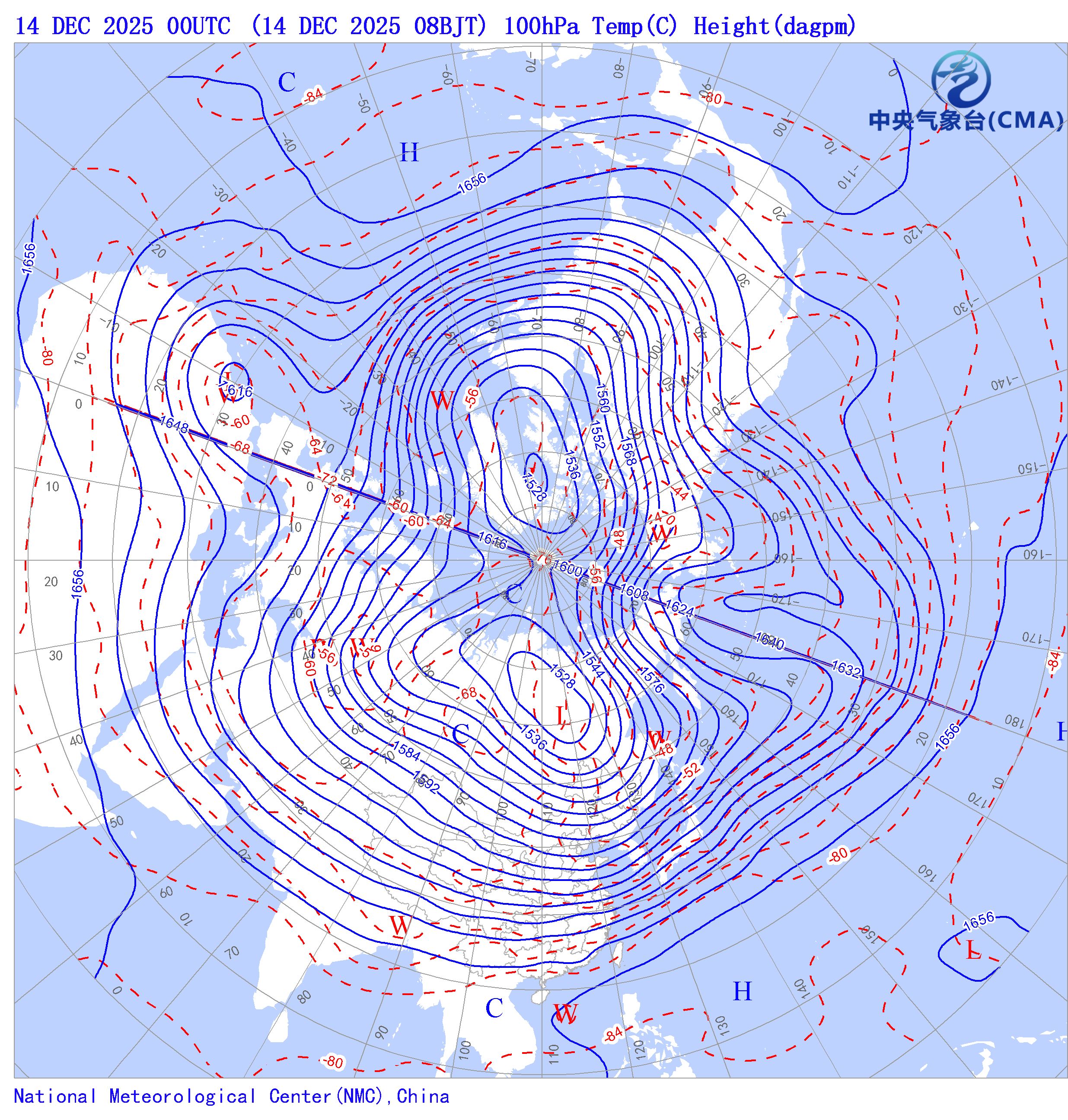 天气系统符号包括:高压中心(H)、低压中心(L)、暖中心(W)、冷中心(C)和台风符号;蓝色等值线为等高线(单位dagpm);红色等值线为等温线(单位℃),其中零摄氏度以下以虚线显示。