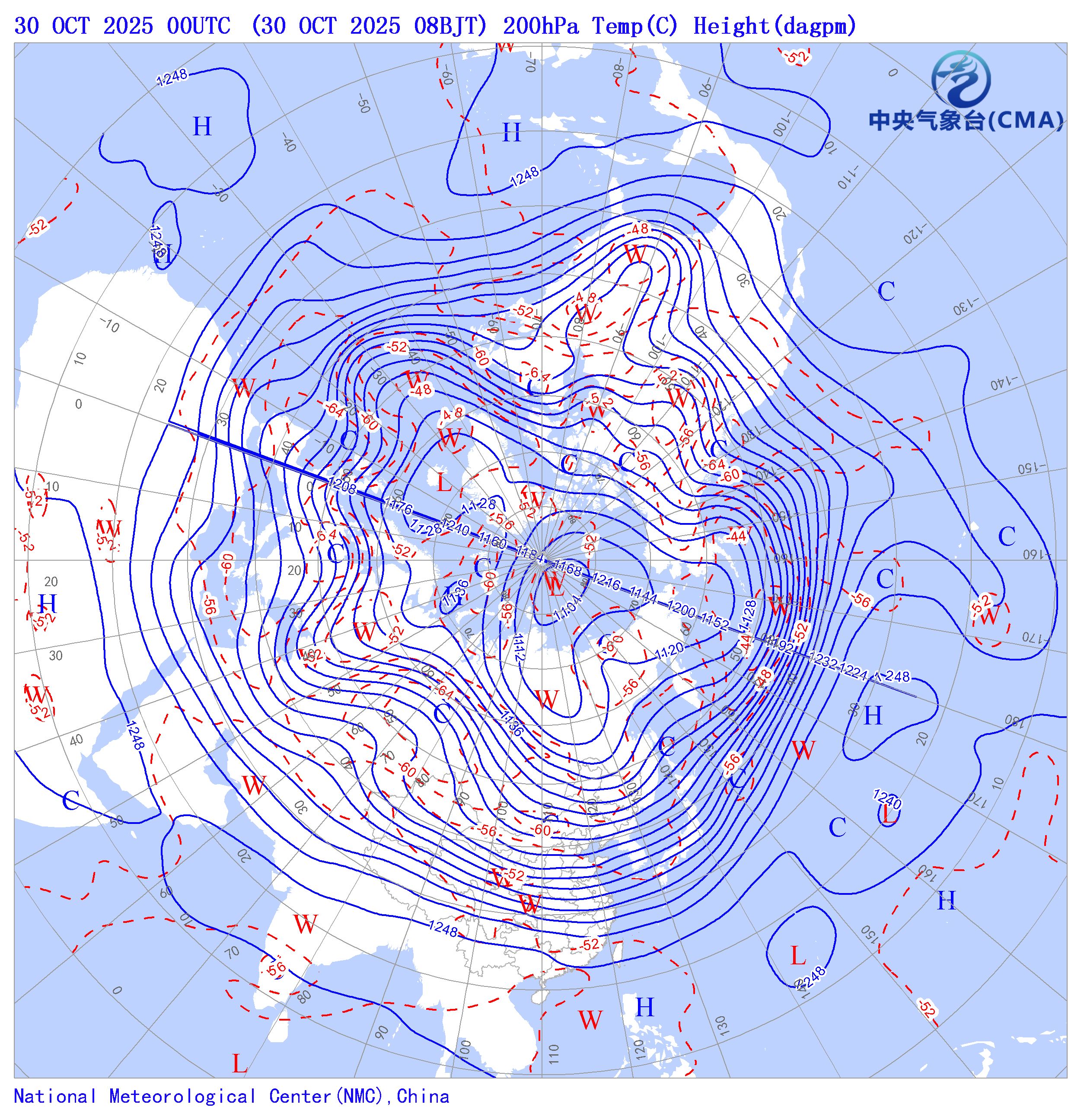 天气系统符号包括:高压中心(H)、低压中心(L)、暖中心(W)、冷中心(C)和台风符号;蓝色等值线为等高线(单位dagpm);红色等值线为等温线(单位℃),其中零摄氏度以下以虚线显示。