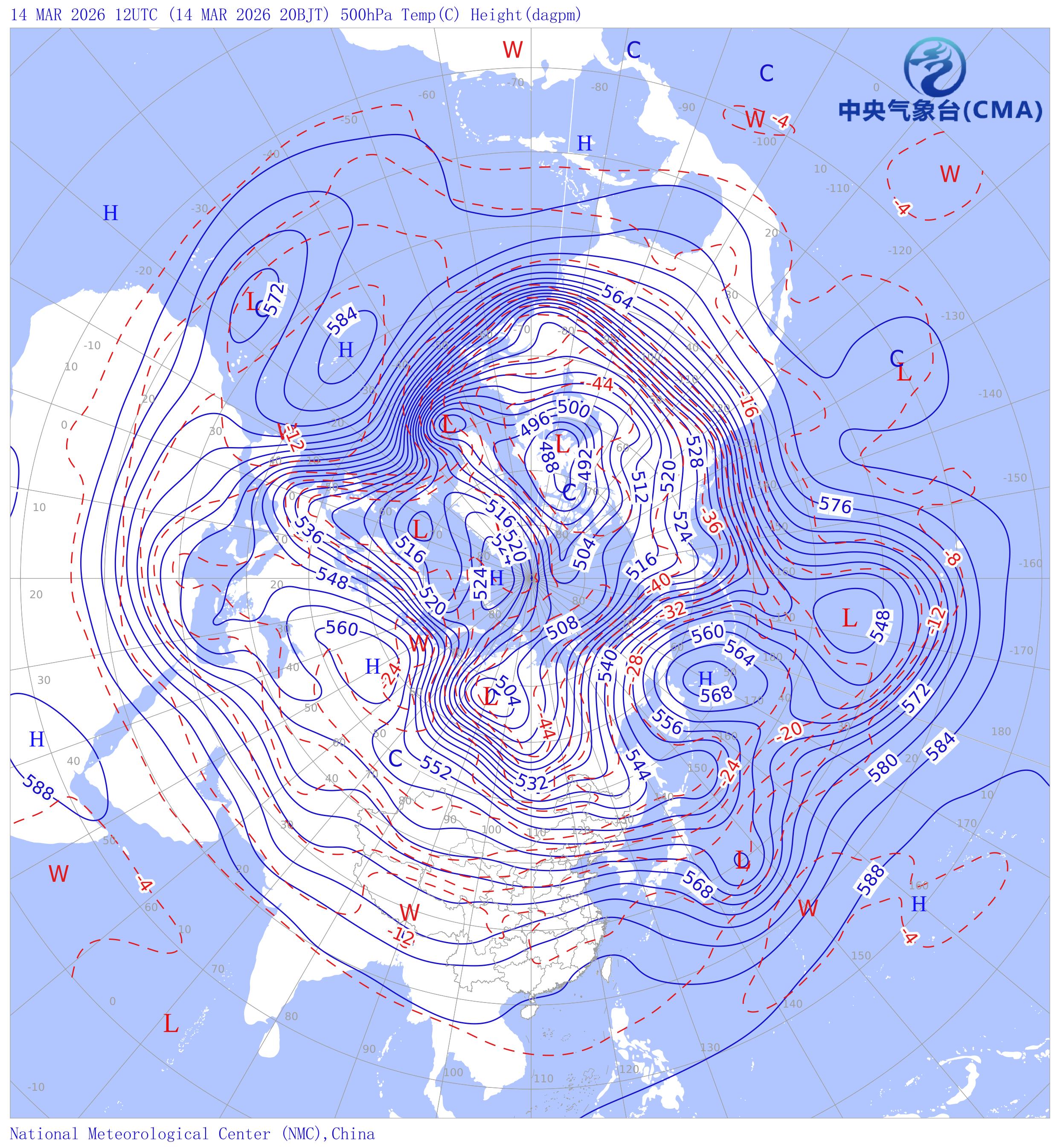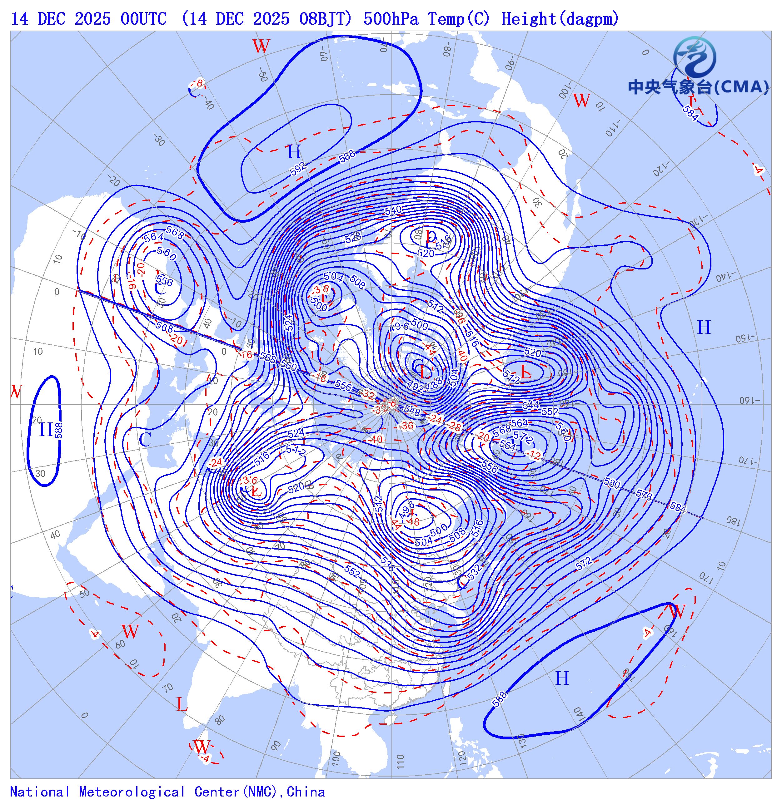 天气系统符号包括:高压中心(H)、低压中心(L)、暖中心(W)、冷中心(C)和台风符号;蓝色等值线为等高线(单位dagpm);红色等值线为等温线(单位℃),其中零摄氏度以下以虚线显示。
