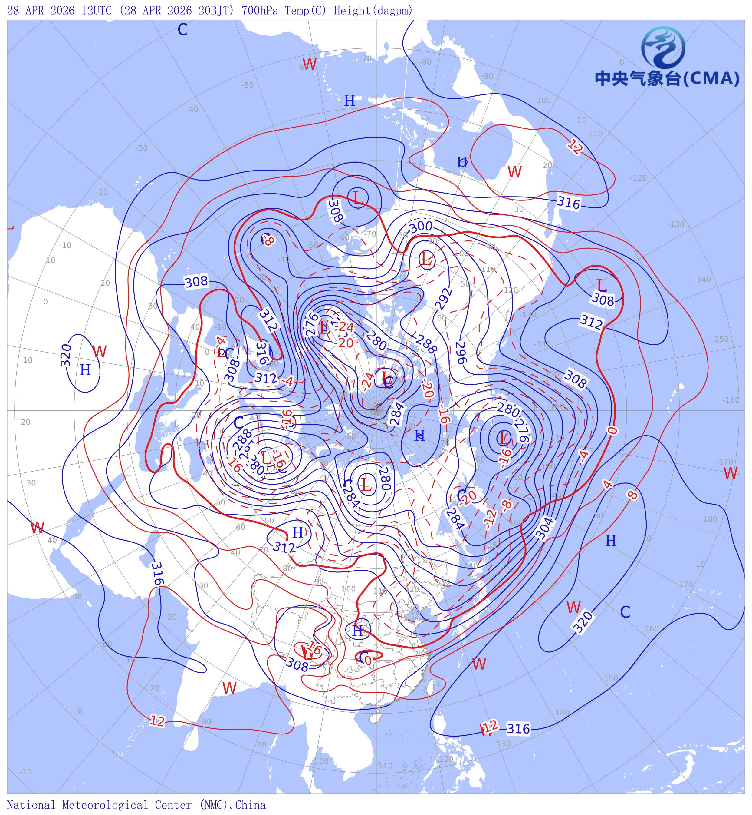 天气系统符号包括:高压中心(H)、低压中心(L)、暖中心(W)、冷中心(C)和台风符号;蓝色等值线为等高线(单位dagpm);红色等值线为等温线(单位℃),其中零摄氏度以下以虚线显示。