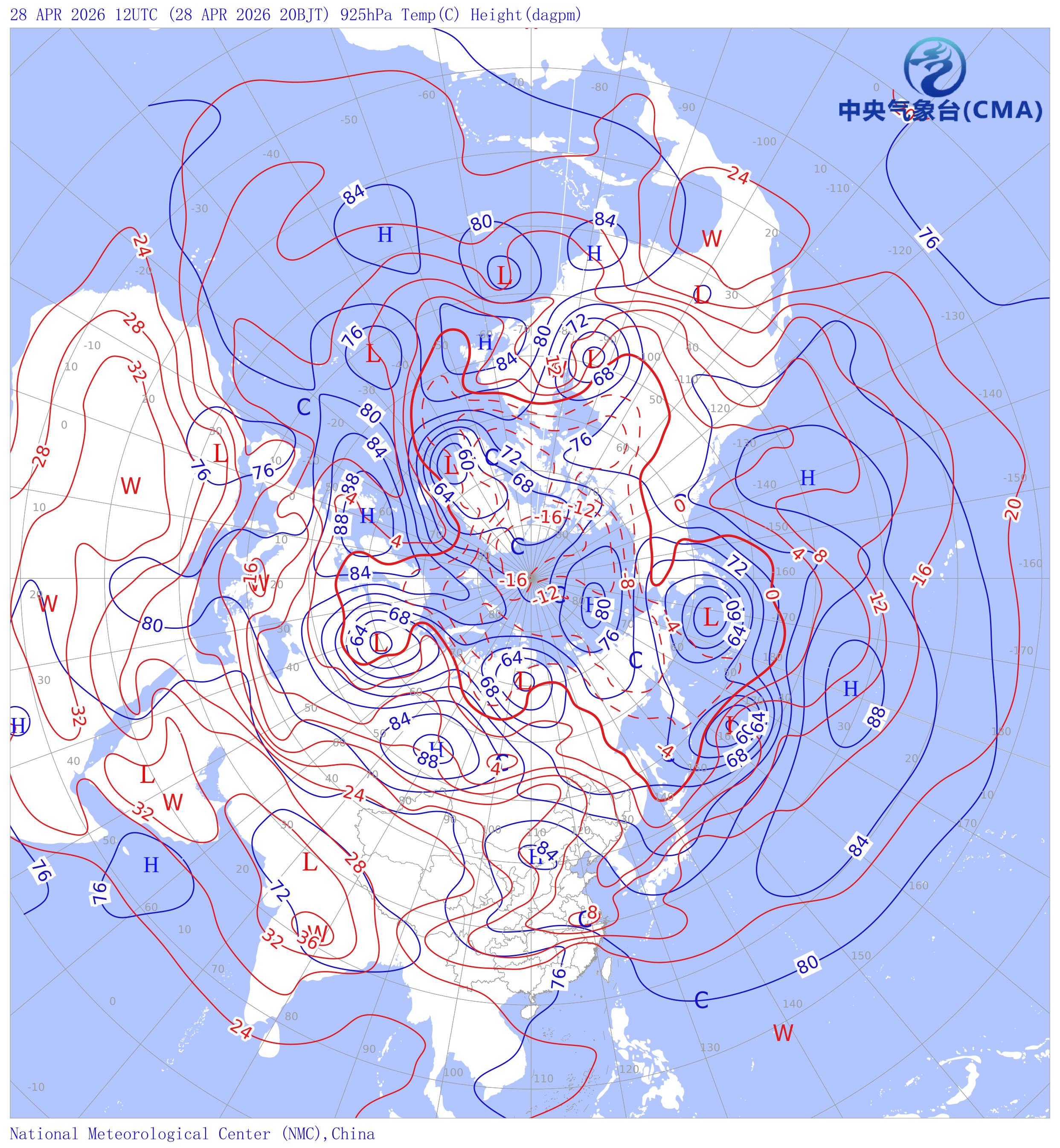 天气系统符号包括:高压中心(H)、低压中心(L)、暖中心(W)、冷中心(C)和台风符号;蓝色等值线为等高线(单位dagpm);红色等值线为等温线(单位℃),其中零摄氏度以下以虚线显示。