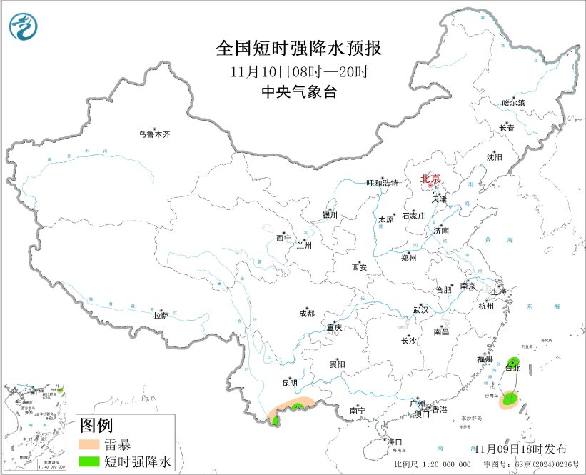 预计11月9日20时至10日20时,云南东南部、台湾岛北部和南部等地的部分地区将有短时强降水天气,小时雨量20-30毫米,局地可达30毫米以上。