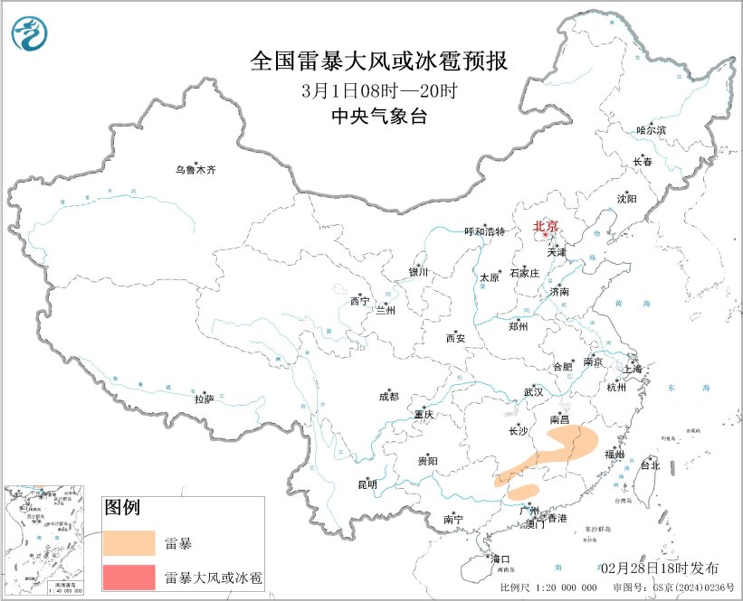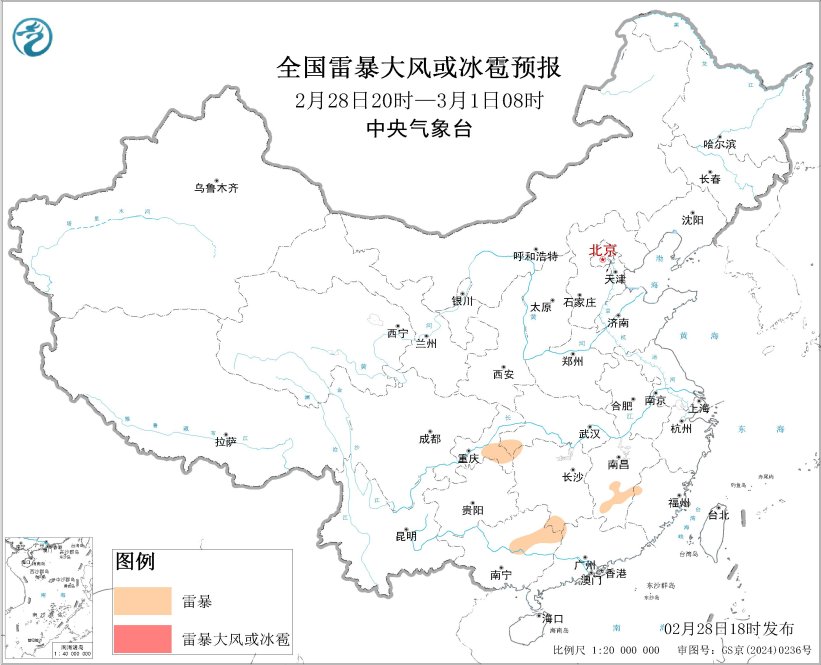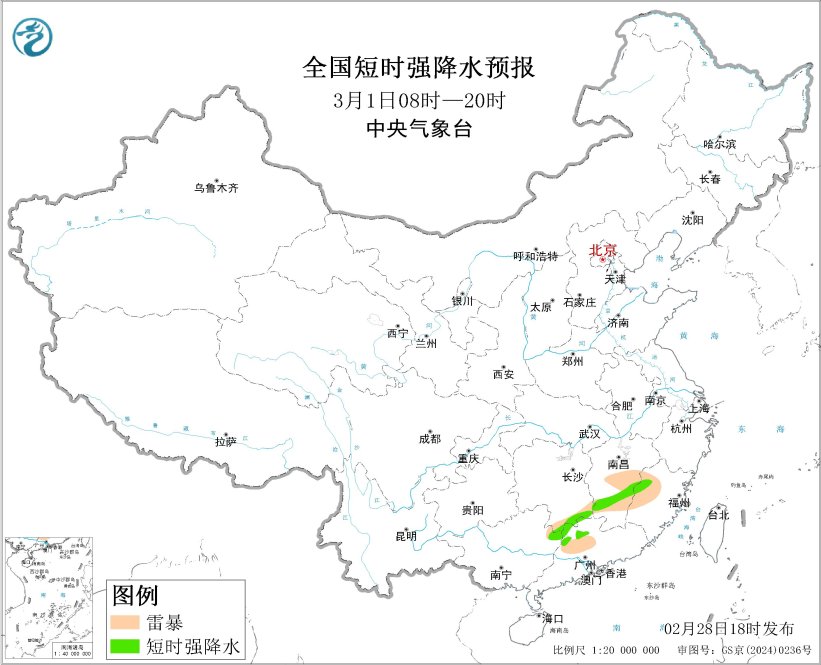 预计2月28日20时至3月1日20时,湖南南部、江西中南部、福建西北部、广西东北部、广东西北部等地的部分地区将有短时强降水天气,小时雨量20-40毫米,局地可达40毫米以上;另外,重庆东南部、湖北西南部、湖南南部、江西中南部、福建中西部、广西东北部、广东西北部等地的局地将有雷暴。