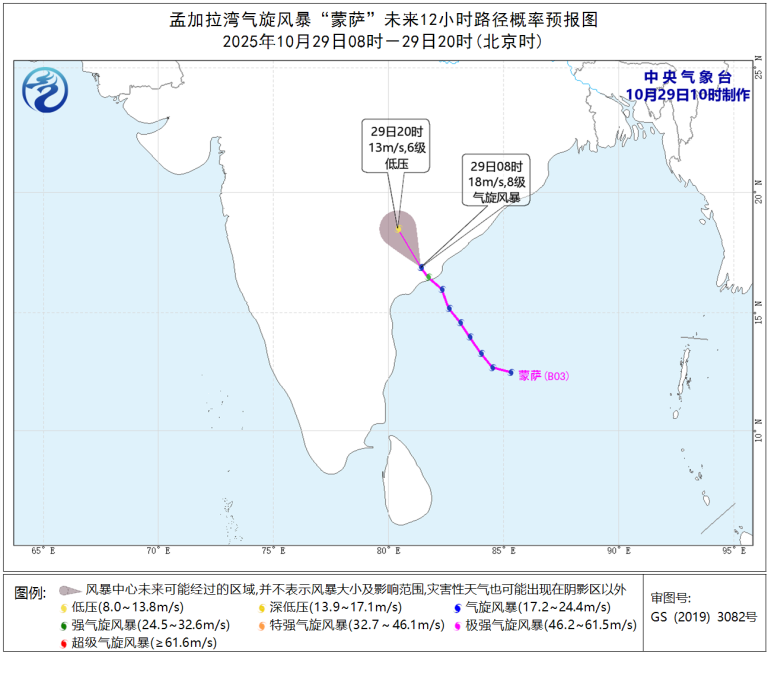 变化过程: “蒙萨”已于今天凌晨2点在印度安得拉邦东北部沿海登陆,登陆时中心附近最大风力10级(25米/秒,相当于我国的强热带风暴级),过去24小时,“蒙萨”由9级增强至10级,登陆后减弱至8级